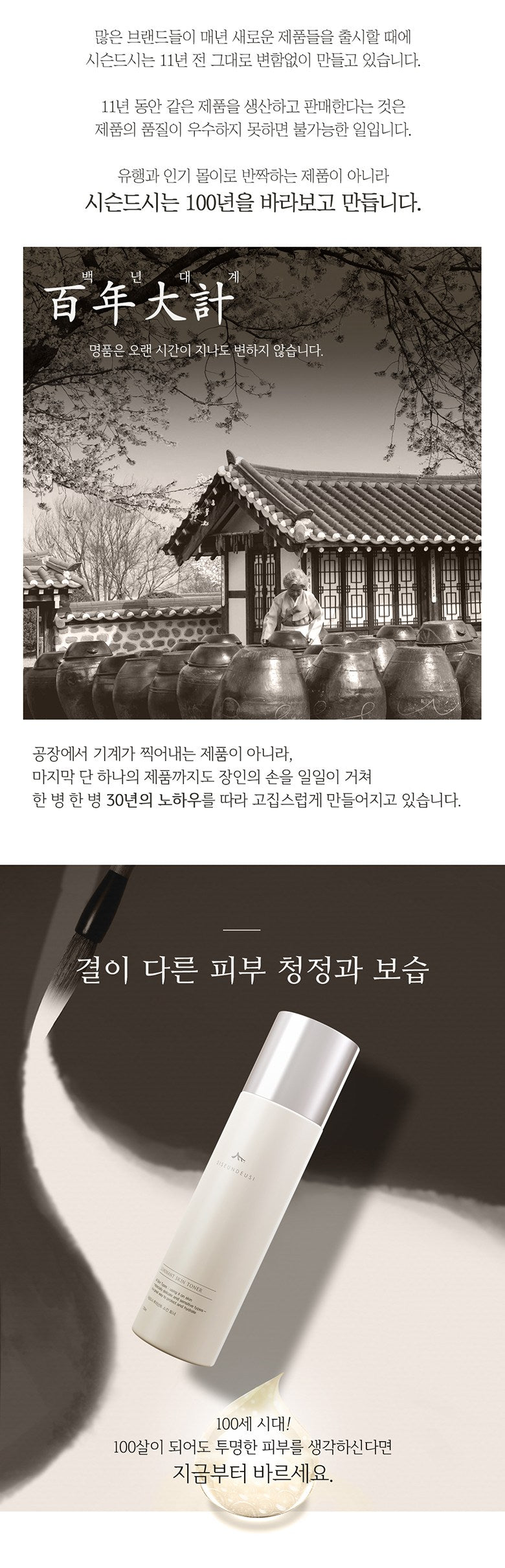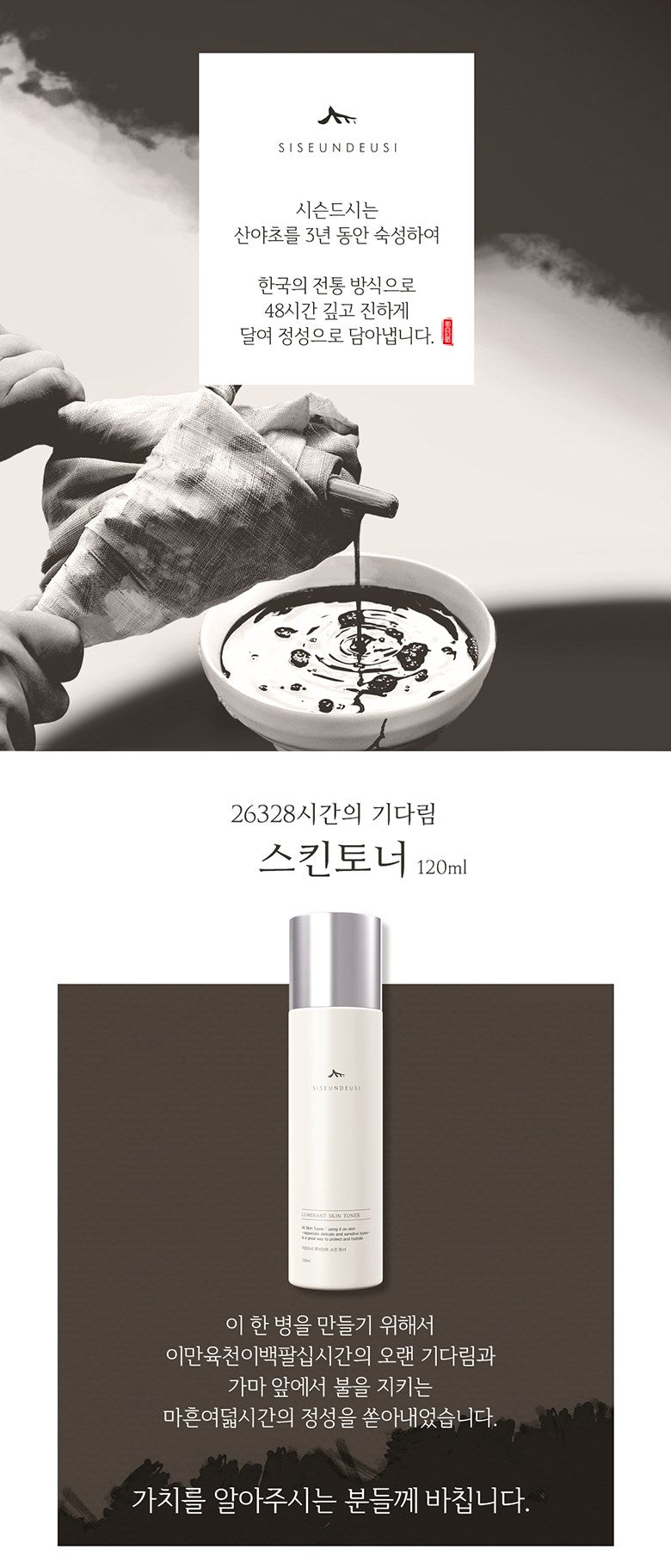 SISEUNDEUSI Skin Toner seamlessly blends traditional Korean skin care methods with contemporary needs. Each 120ml bottle is a testament to our heritage, featuring wild herbs fermented for 26,328 hours and boiled for 48 hours. This process, symbolizing our dedication to craftsmanship, results in a product of unparalleled quality.