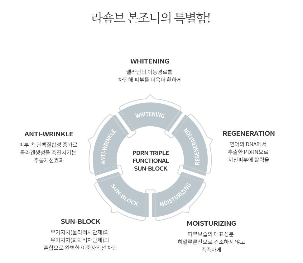 It is a product that has both the role of a UV absorber and a scattering agent and has the UV blocking function of SPF50, PA++++. It completely blocks both UVA, which causes fine lines and skin aging and UVB which is the main cause of photodamage to the skin, such as erythema and pigmentation. In addition, it is designed so that it does not smear even sweat or water caused by the heat, so it has more perfect UV protection effect, and it applies softly and smoothly without white cast.