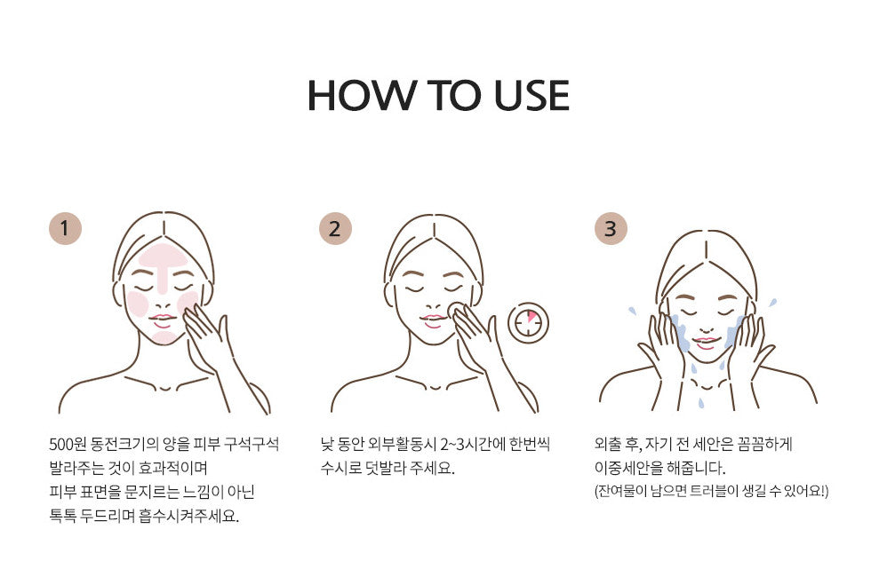 -It is effective to apply an amount the size of a 500 won coin to every corner of the skin, and tap it for absorption rather than rubbing the surface of the skin.