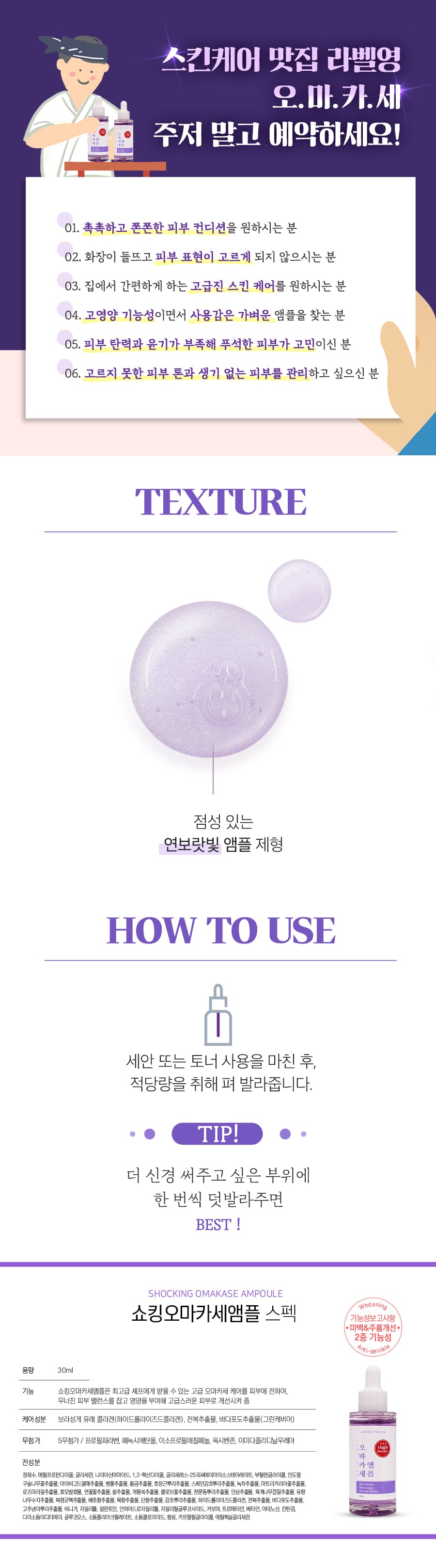 Là những buổi tiệc của cảm xúc, Omakase Ampoule mang lại hương sắc và sinh lực cho làn da. Cảm nhận từng giọt collagen từ nhum tím thực sự giống như đưa một đầu bếp vào phòng tắm!