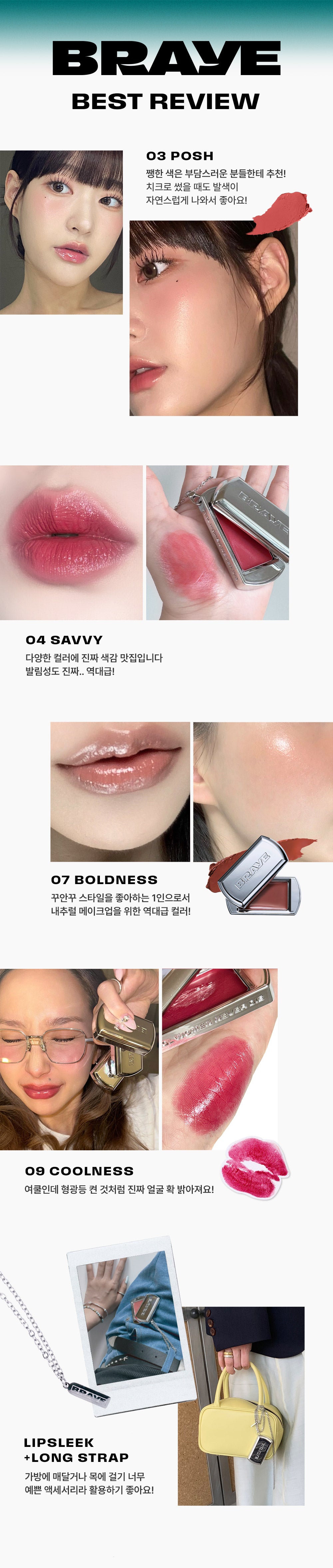 Discover the BRAYE Lipsleek, a versatile lip and cheek product with a unique melting texture that effortlessly blends into the skin. The buildable formula becomes more vivid with each layer, allowing you to create a variety of looks with a single color. Whether used on the lips, cheeks, or elsewhere, BRAYE Lipsleek provides endless possibilities for makeup creativity.