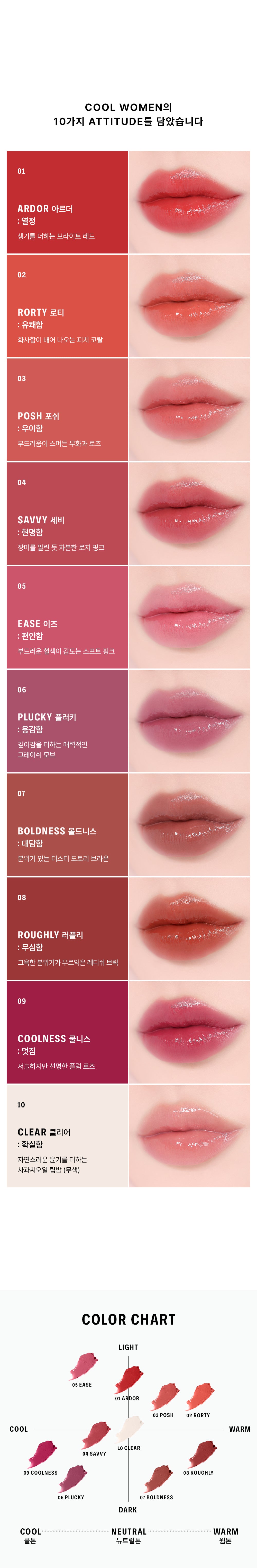 - 10 Clear: Apple seed oil lip balm providing a neutral, glossy finish.