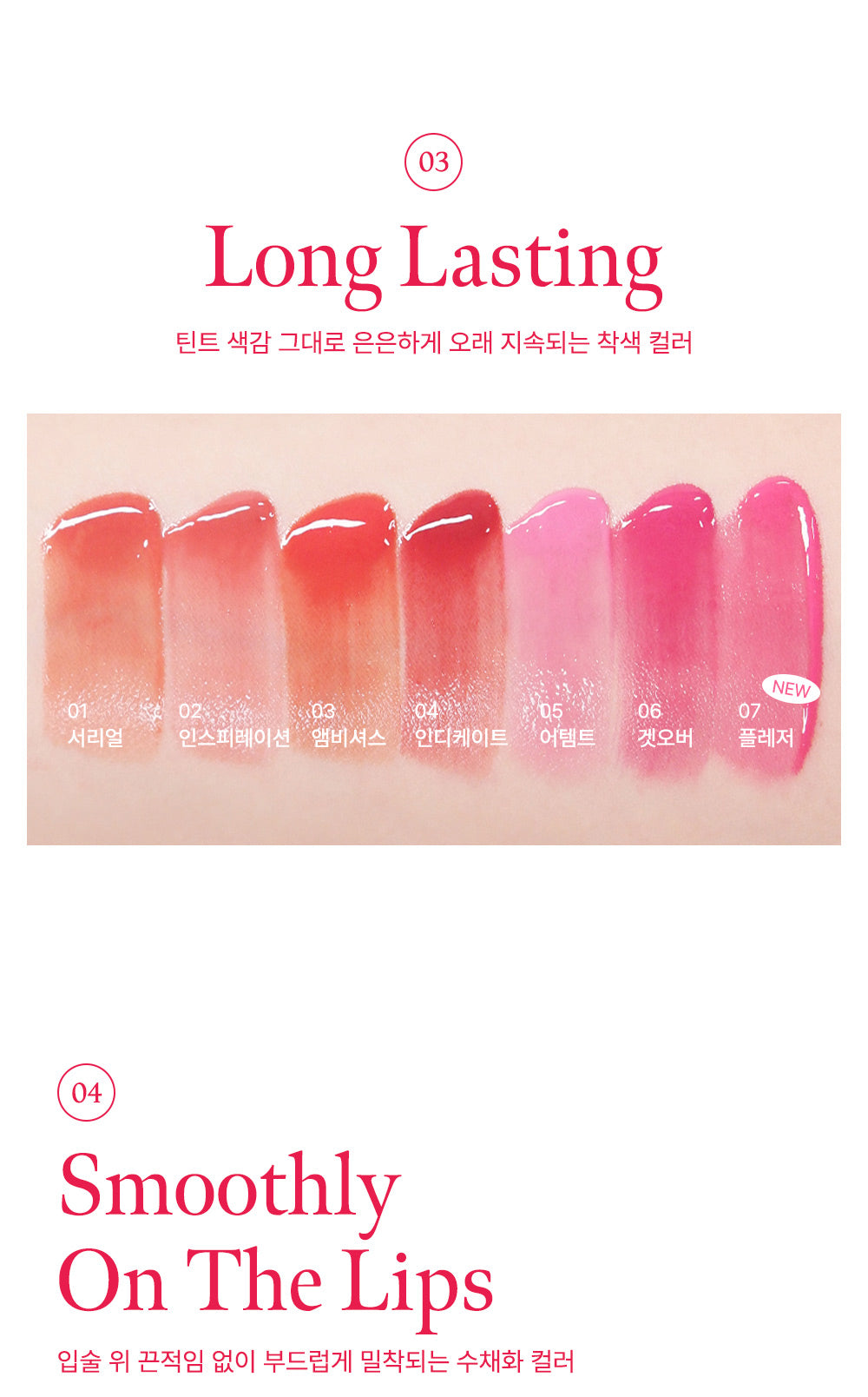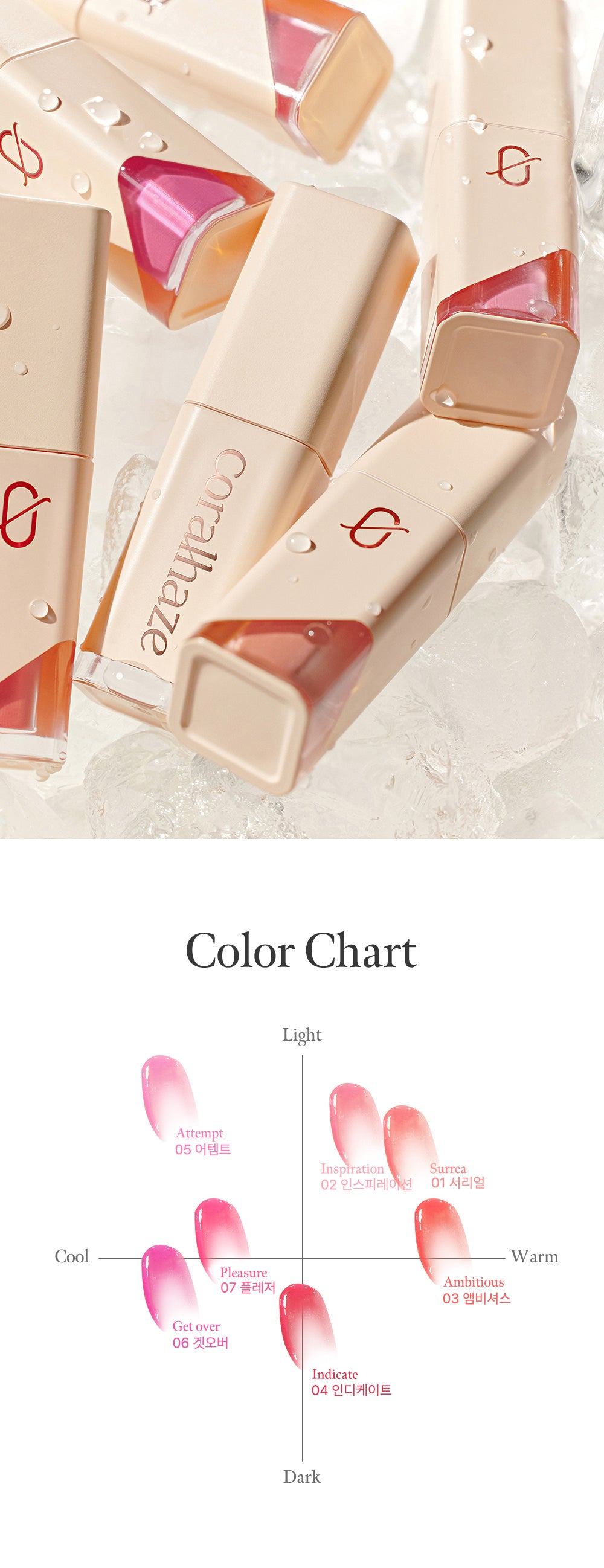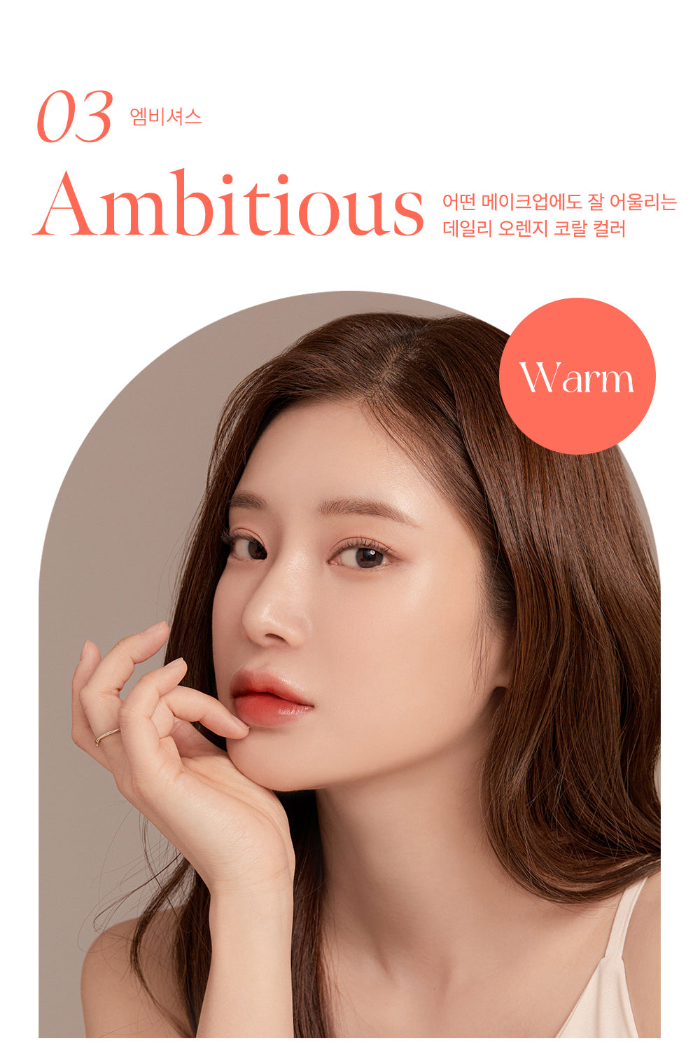 - Bright Coral Warm Tone: For a soft coral that brightens your face, try combining shades 01 + 03.