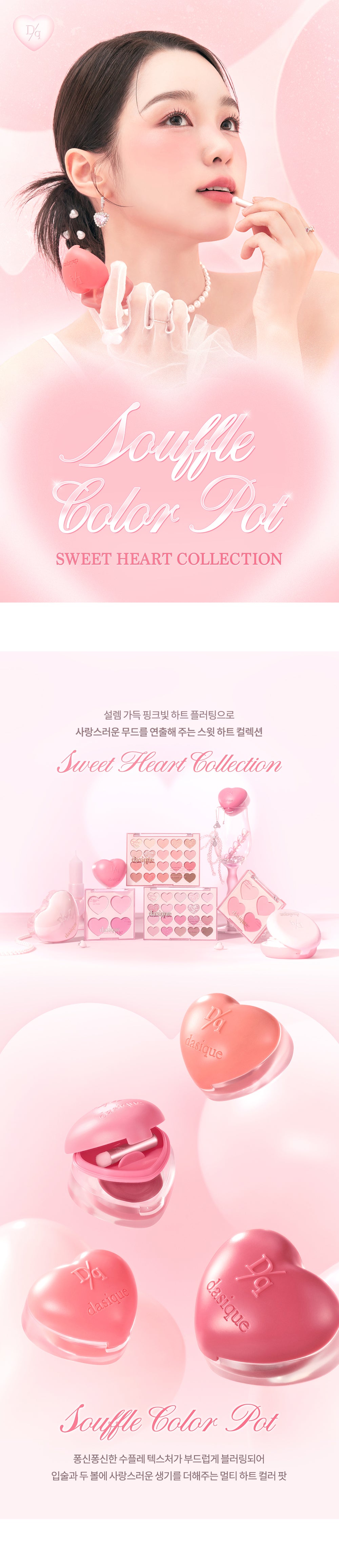 Experience the charming, airy beauty of dasique’s Souffle Color Pot from the Sweet Heart Collection, designed to add a romantic, rosy glow to your lips and cheeks. With 15 delicate shades in a soft, fluffy texture, this collection is ideal for creating a lovely, blushing look that lasts.