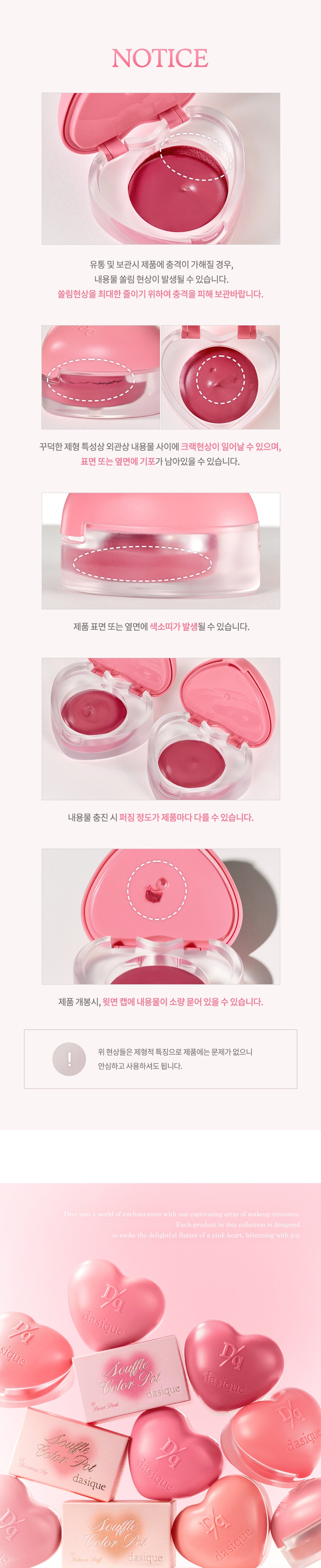 - Formula Characteristics: Due to the nature of the thick, souffle-like formula, some variations may occur, including cracks, pigmented bands, or air bubbles on the product surface. This is normal and does not affect product quality.