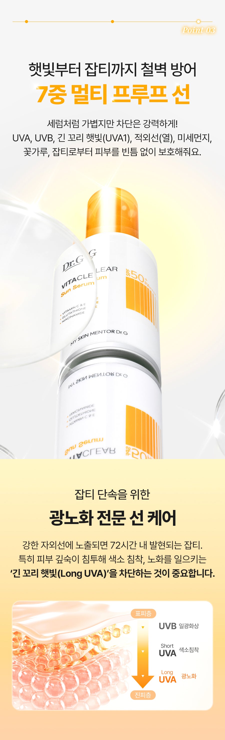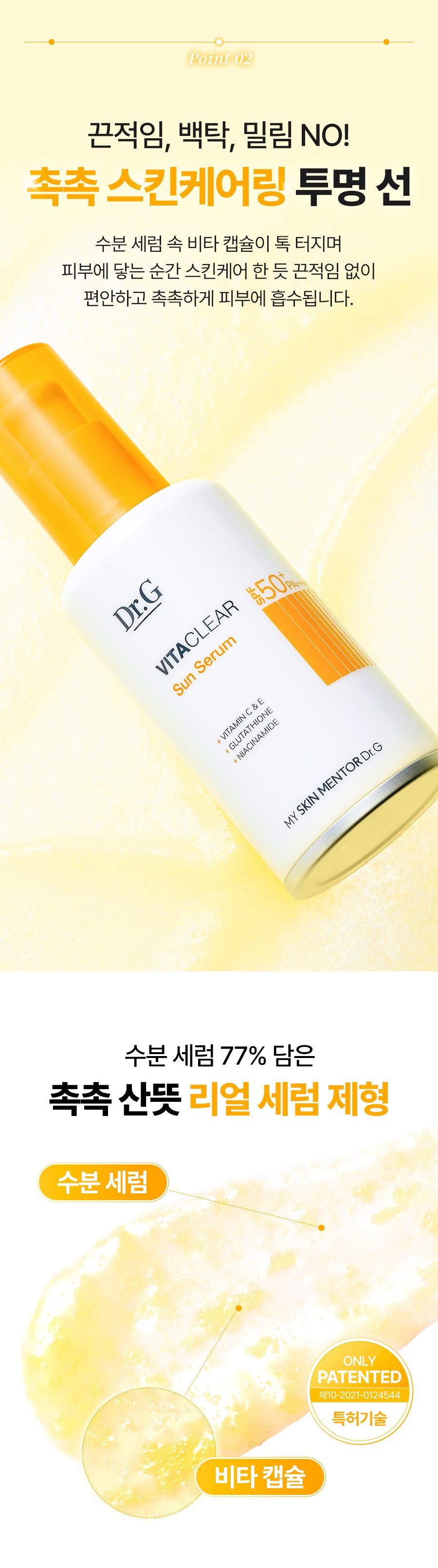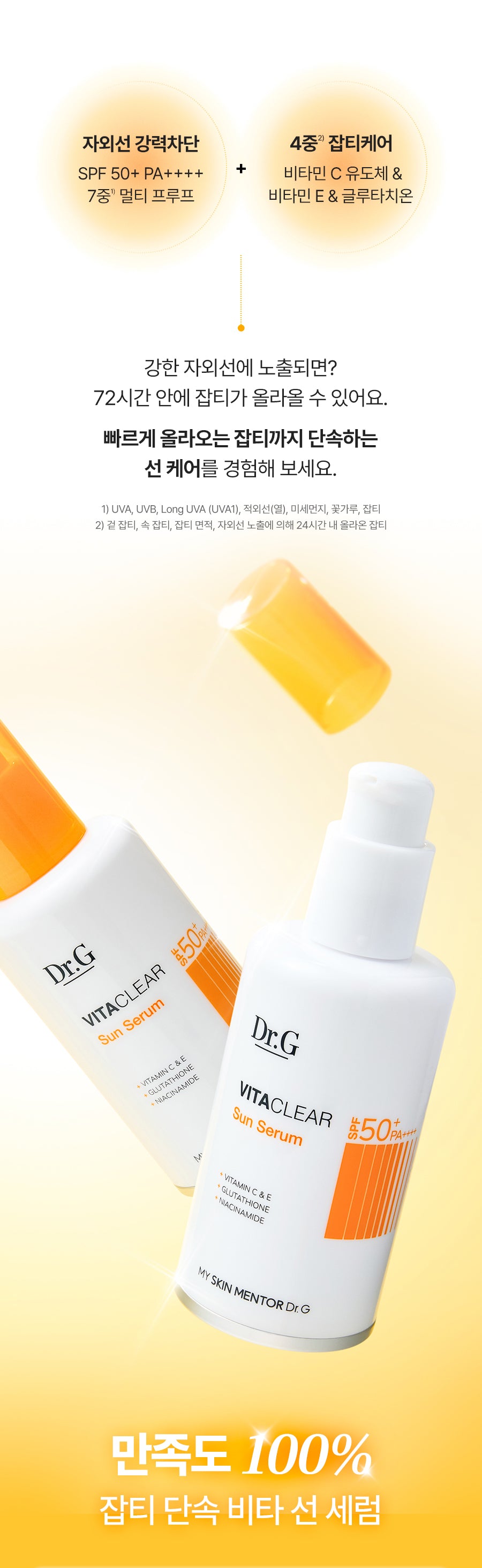Experience the synergy of skincare and sun care with Dr.G Vita Clear Sun Serum—a lightweight, hydrating formula that glides on like a serum while delivering robust SPF50+ PA++++ UV protection. Ideal for sensitive skin, this innovative sun serum helps prevent and improve the appearance of blemishes, dark spots, and discoloration in just four weeks.