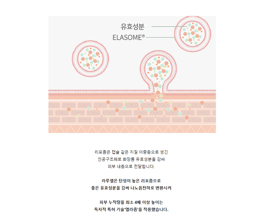 A patented system that encapsulates active ingredients in highly elastic liposomes for 4x better absorption into the skin (Patent 10-1796822).