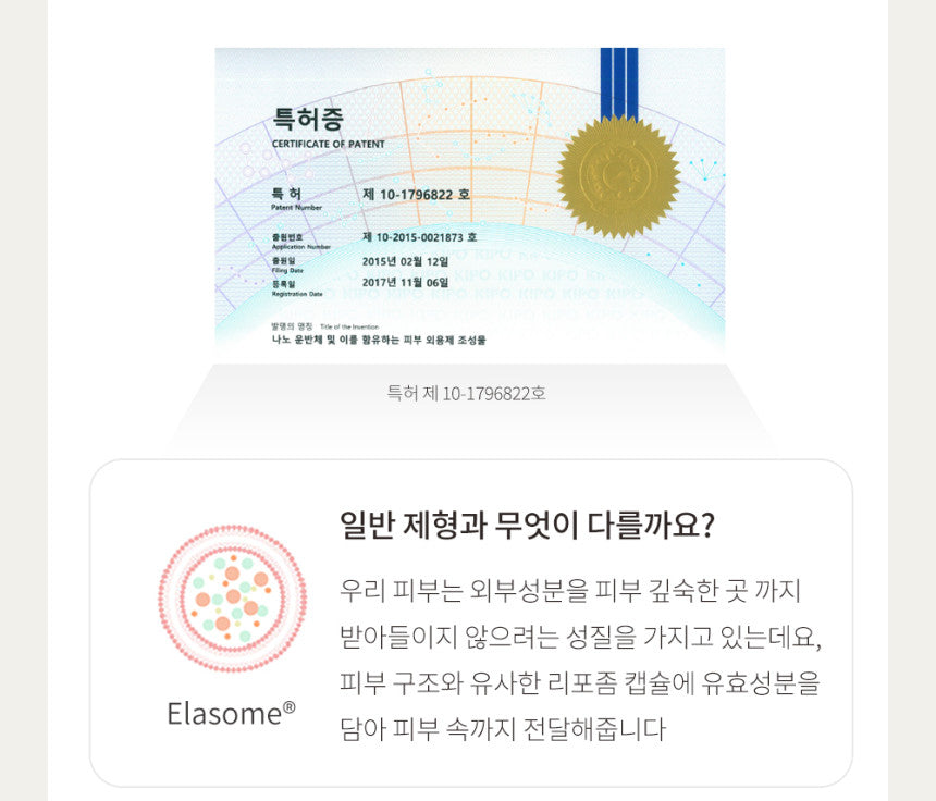 A patented system that encapsulates active ingredients in highly elastic liposomes for 4x better absorption into the skin (Patent 10-1796822).