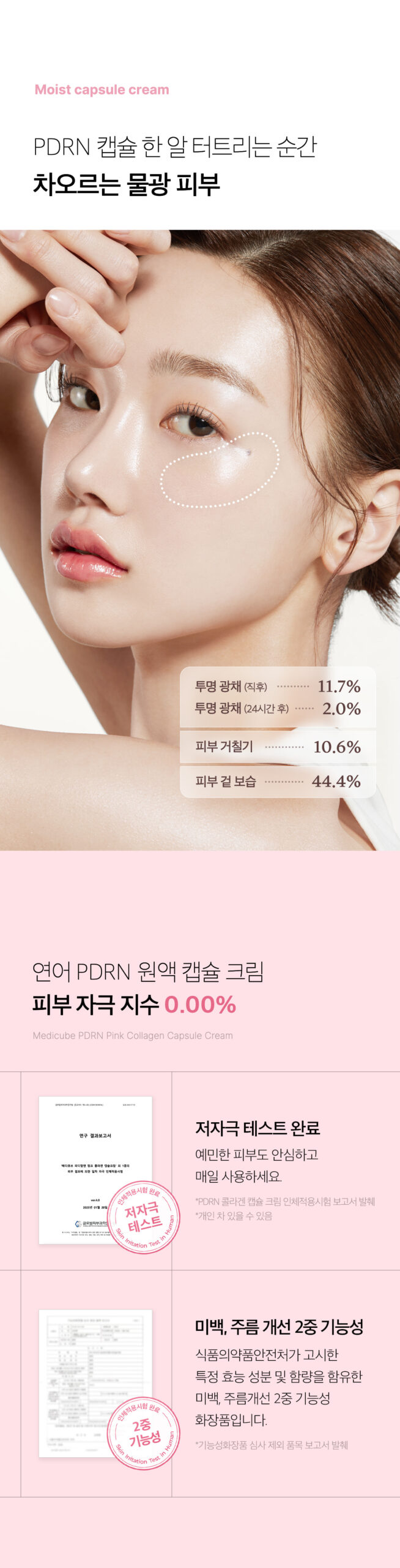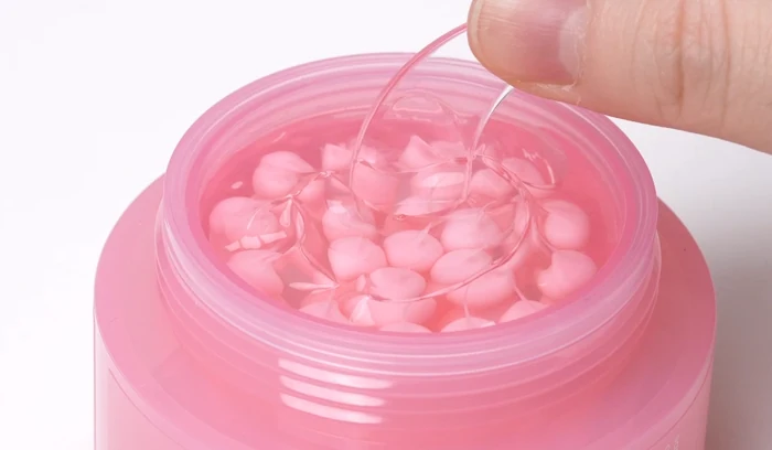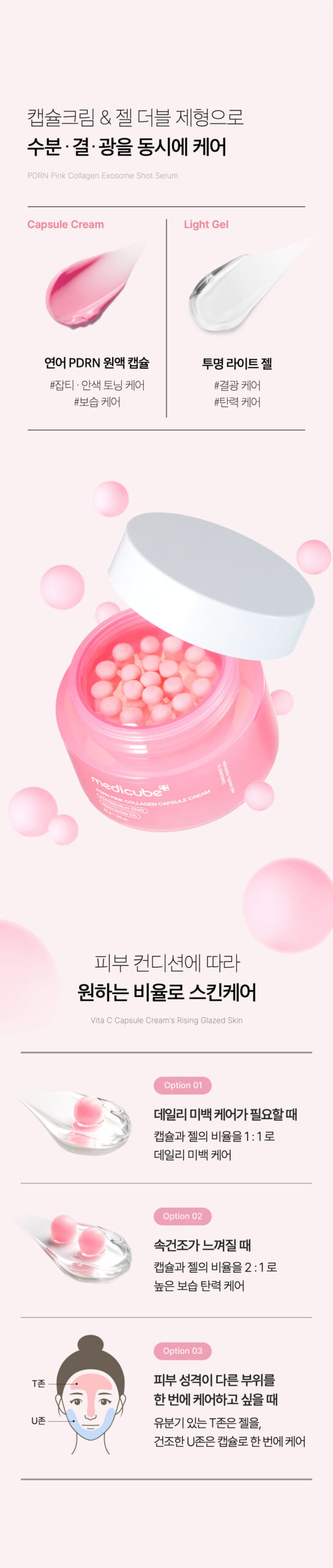 At the final step of your skincare routine, mix the pink capsule and the transparent gel on the back of your hand. Gently apply the blend to your face following your skin’s texture.