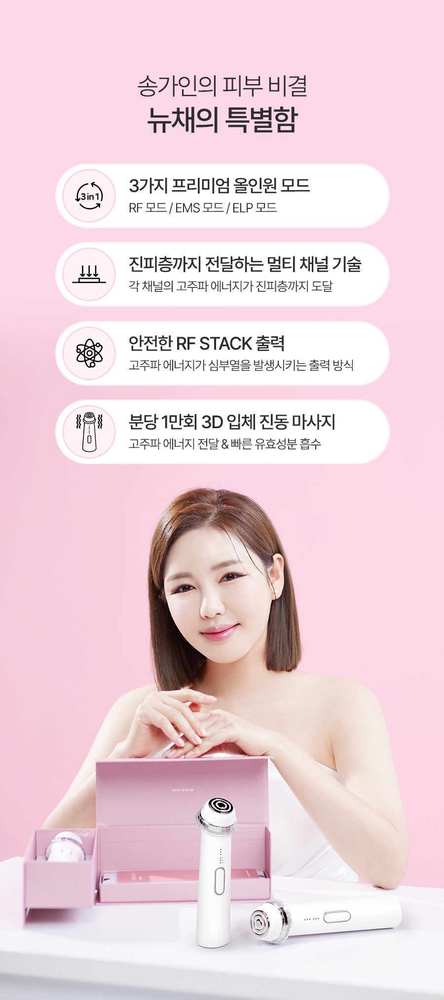 - Delivers high-frequency energy and promotes fast absorption of effective ingredients through 10,000 micro-vibrations per minute.
