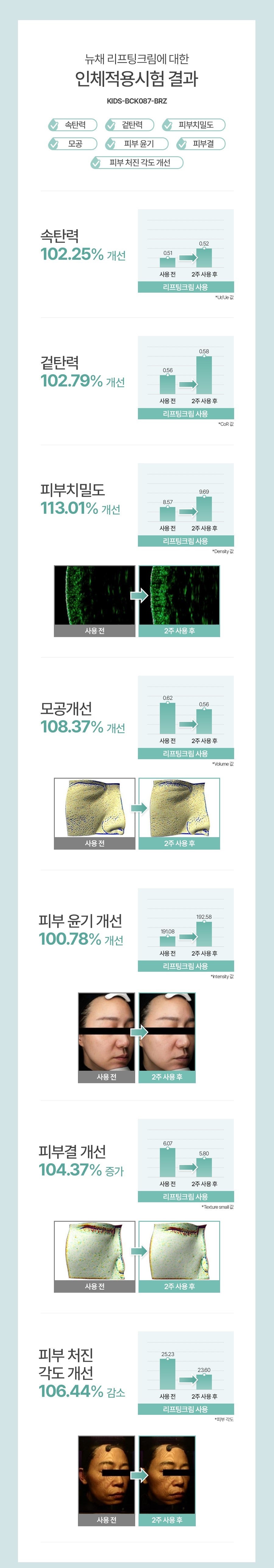 - Improved skin elasticity, density, pore size, gloss, texture, and reduced sagging.