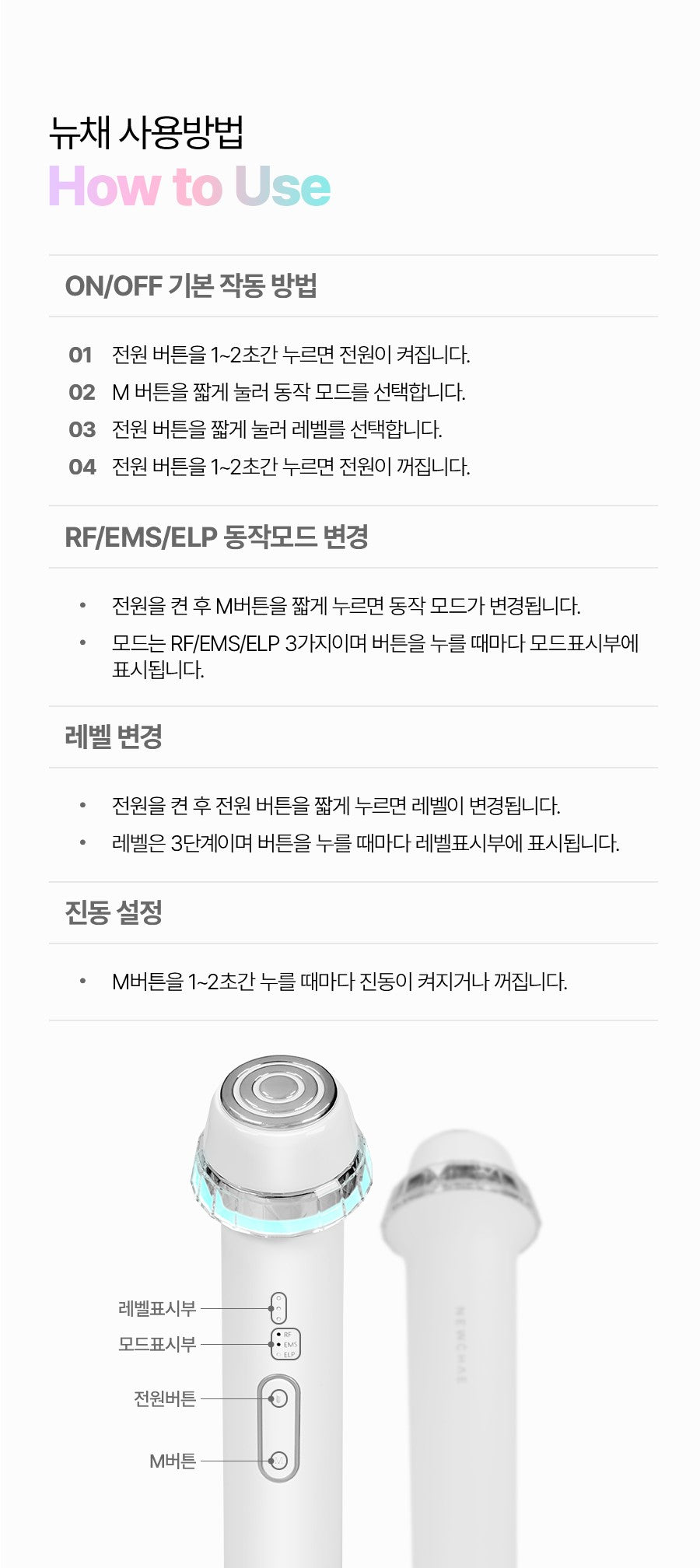 - RF/EMS/ELP Modes: Change the operation mode by pressing the M button briefly after powering on.