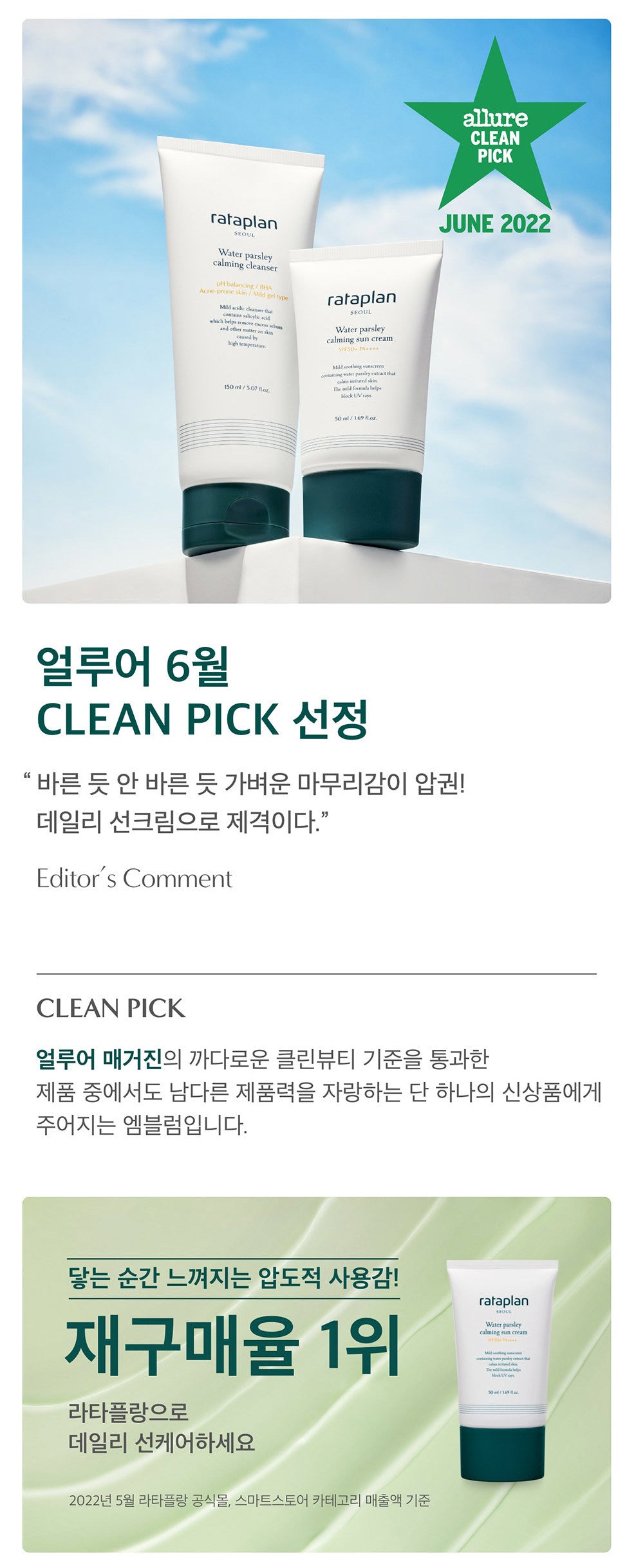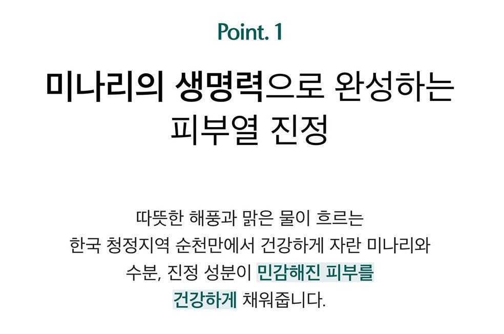 Water parsley, moisture and calming ingredients grown healthy in Suncheon Bay, a clean area in Korea where the warm sea breeze and clear water flow, replenish sensitive skin.