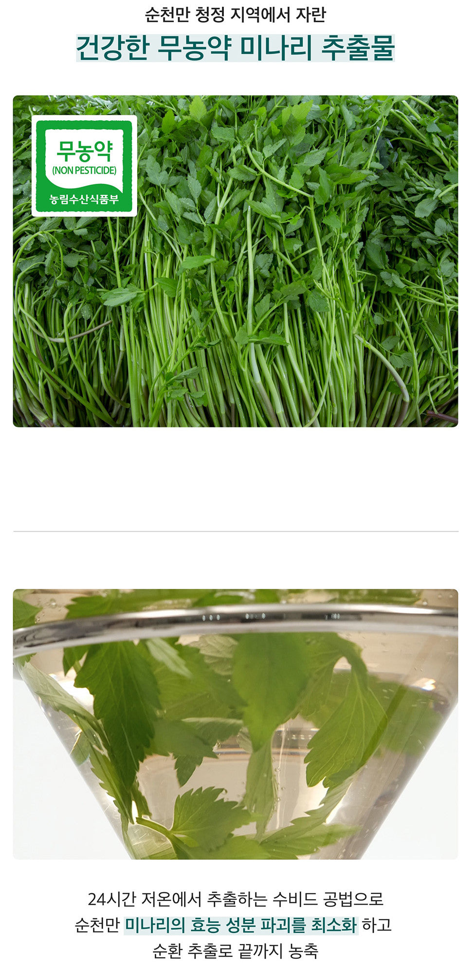 Only eco-friendly water parsley, which has been certified as pesticide-free through an agreement with Suncheon City, is used as a raw material.