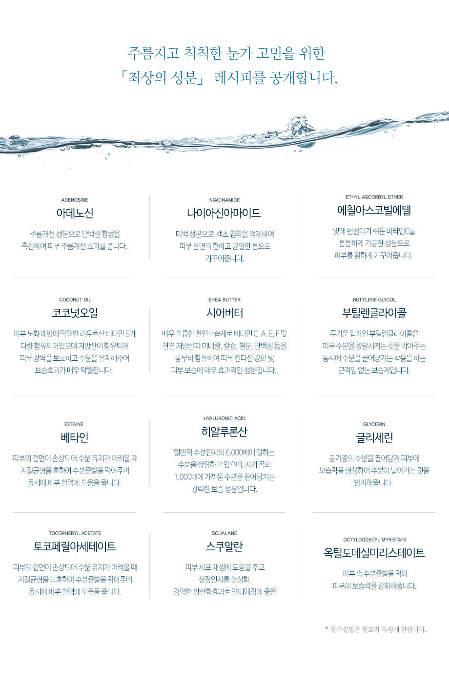 - Enhancing Elasticity and Brightness: Delivers essential ingredients for whitening and wrinkle improvement, making the eye area more elastic and luminous.