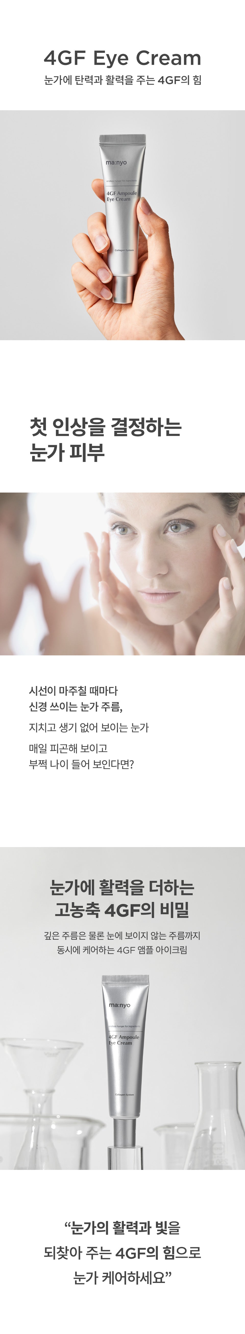 Discover the power of ma:nyo Factory’s 4GF Ampoule Eye Cream, designed to combat the signs of aging that begin to accelerate in your late 20s. As your body’s natural 4GF diminishes, you may notice an increase in fine lines and wrinkles around the eyes. Our eye cream harnesses the revitalizing strength of 4GF to care for the delicate eye area, bringing back its vitality and radiance.
