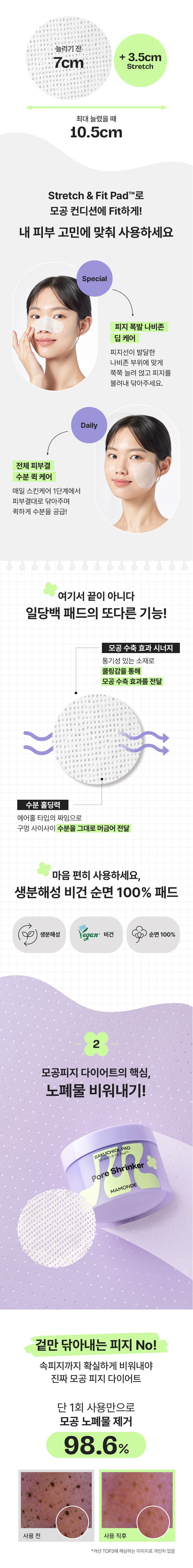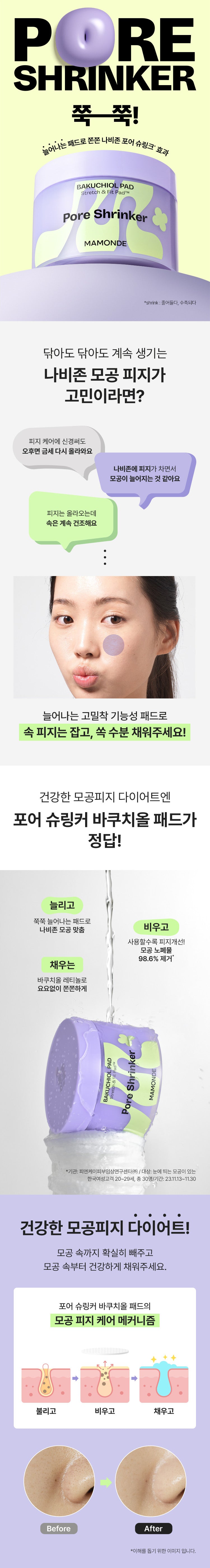 Discover the revolutionary Mamonde Pore Shrinker Bakuchiol Pad, designed to target and diminish the appearance of enlarged pores while tackling excessive sebum production. Ideal for individuals grappling with oily skin, enlarged pores due to sebum overload, and those who suffer from the paradox of inner skin dehydration amidst oily conditions. This innovative product boasts an impressive 98.6% efficiency in purging pore impurities.