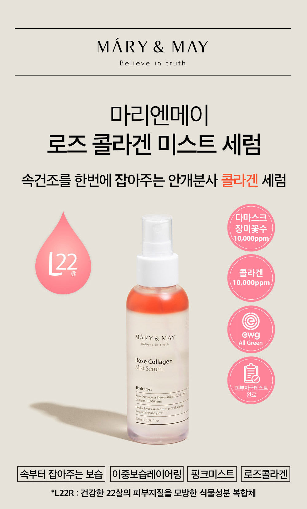 The Mary&May Rose Collagen Mist Serum is dermatologically tested and formulated exclusively with EWG verified, green-grade ingredients, ensuring it’s gentle and safe for your skin.