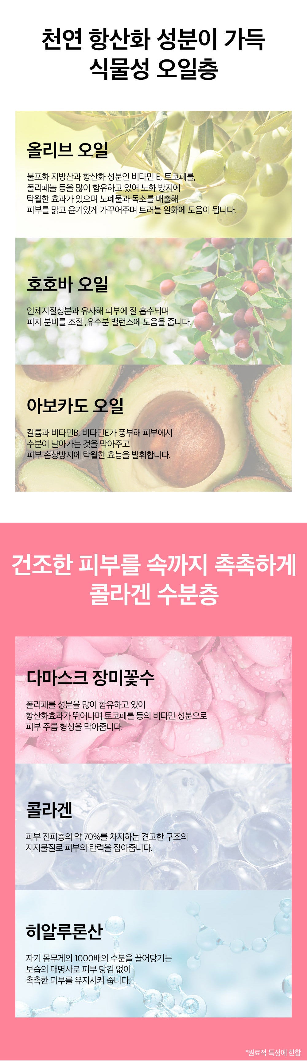 - A moisture layer (comprising Damask Rose Water, Collagen, Hyaluronic Acid) that deeply penetrates the skin.