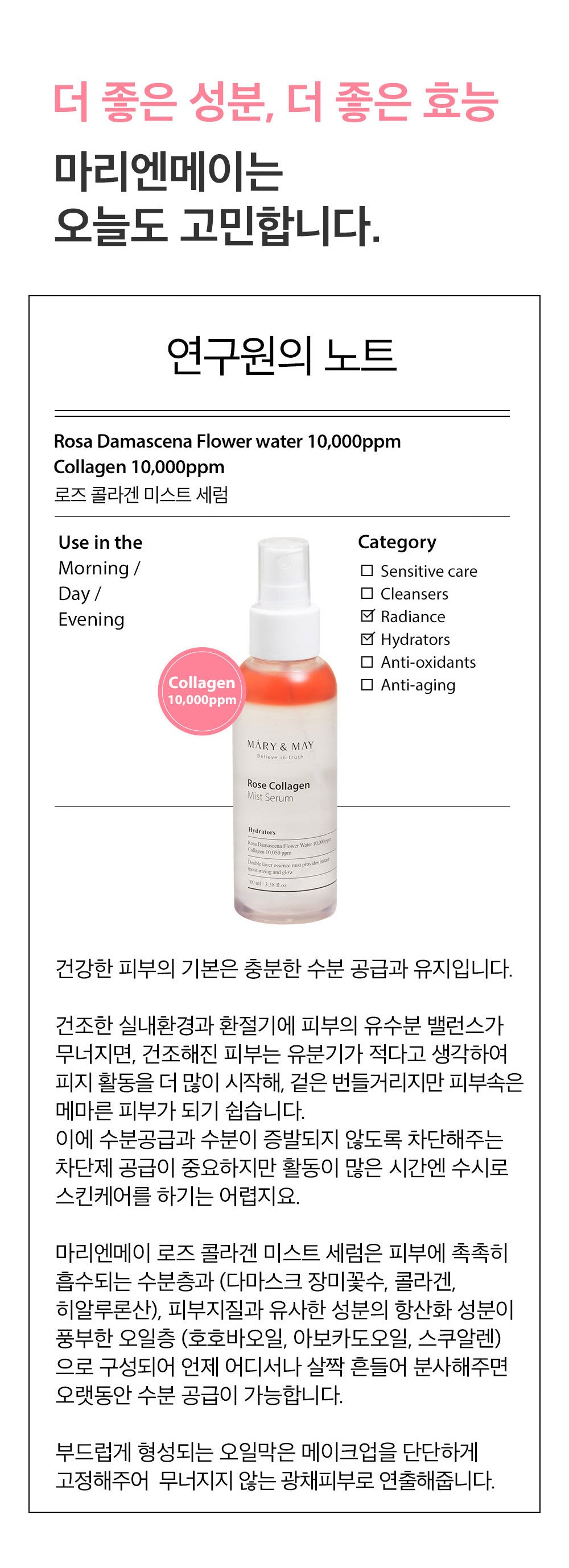 最初は半信半疑でしたが、Mary&Mayのローズコラーゲンミストセラムを試してみたら、その良さに驚かされました。この製品は確かに10,000ppmのダマスカスバラ花水と同じ量のコラーゲンを配合していますので、深い潤い感があります。忙しい日々で皮膚が疲れ気味ですが、このミストは使用すると瞬時にハリやツヤを与えてくれる印象です。それだけではなく、高ポリフェノール成分のお陰なのか、小じわも目立たない感じになります。ただ美容液というより少し化粧水寄りなので、美容ルーチンとして利用するには十分です。