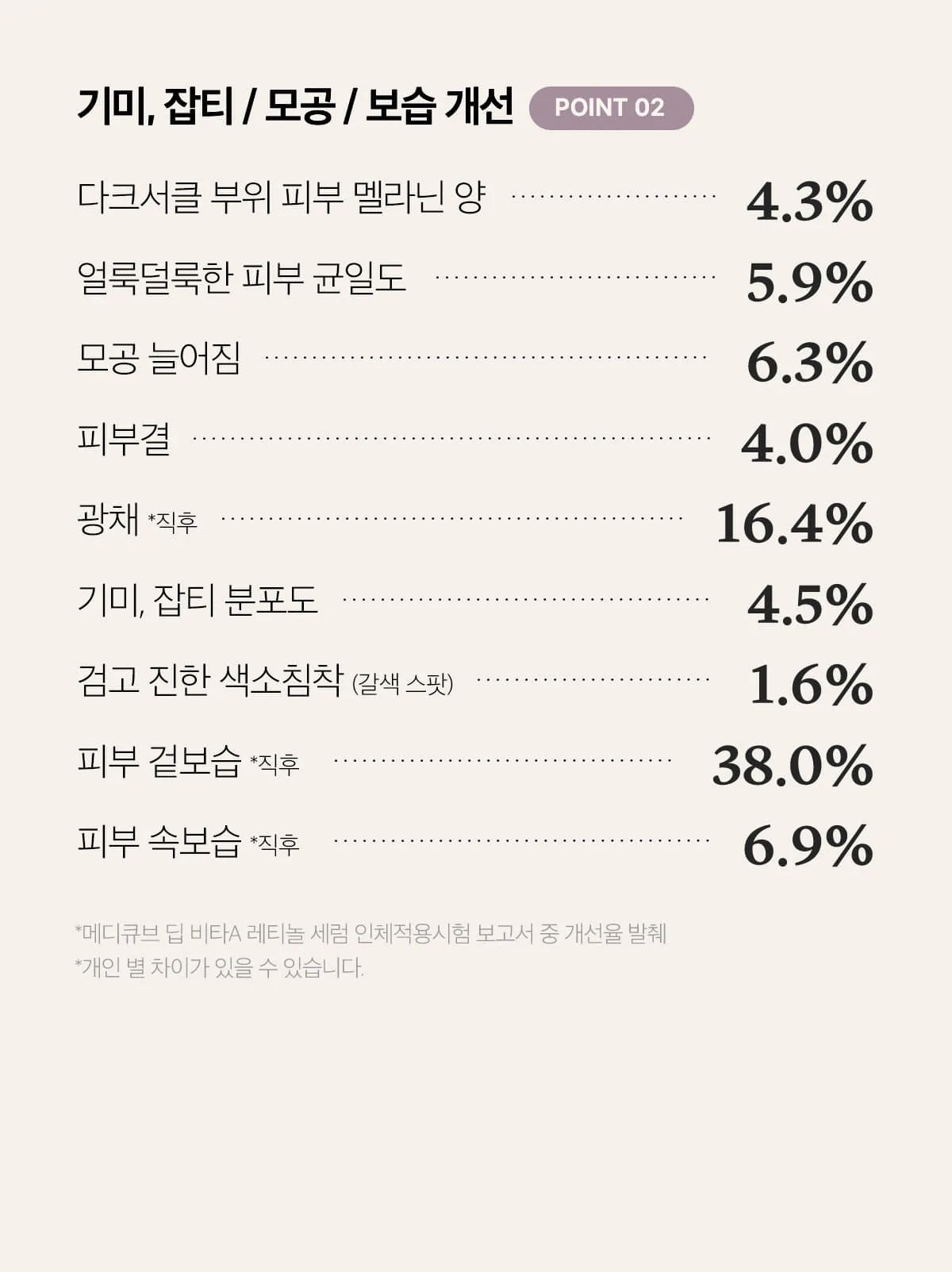 - Retinol: A blend of 0.1% 4th generation retinol HPR, 1% pure retinol complex, and 100PPM bakuchiol, a plant-derived alternative, work synergistically for enhanced collagen production.