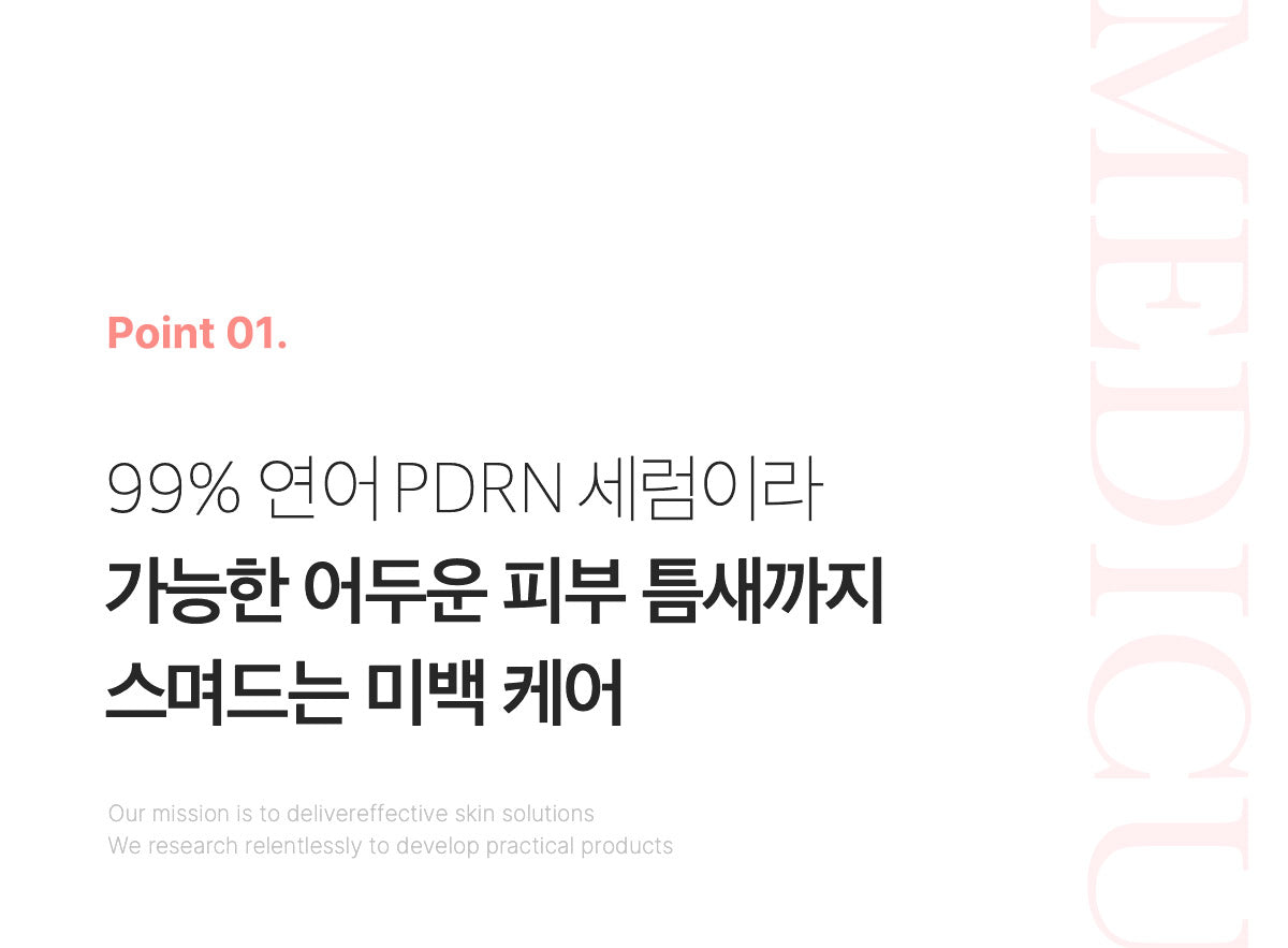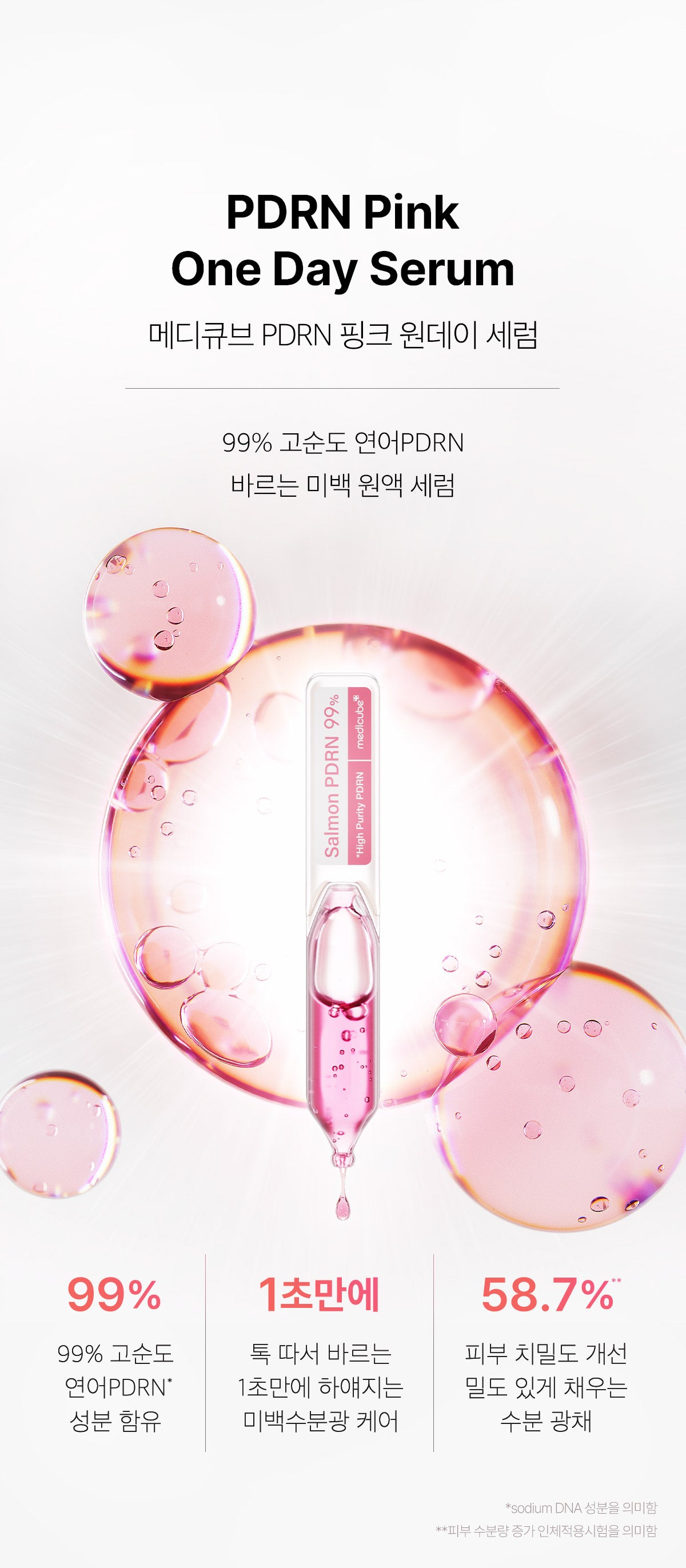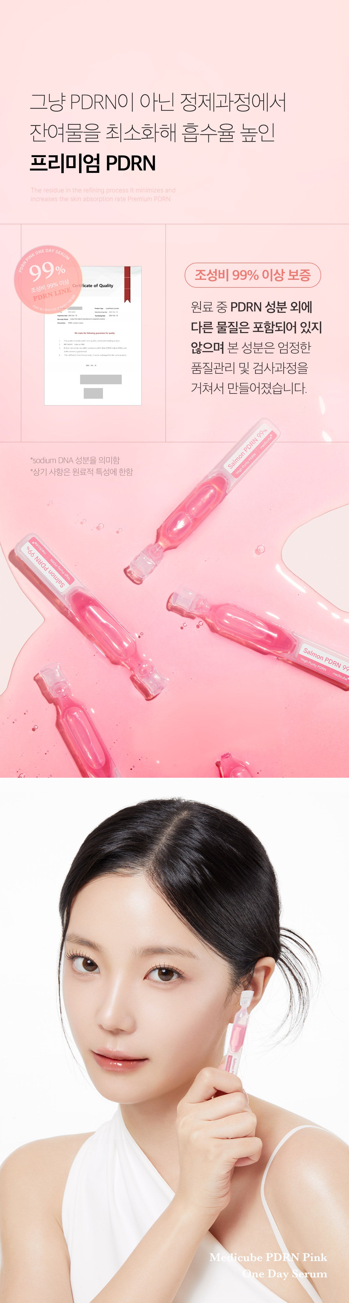 The Medicube PDRN Pink One Day Serum contains 99% high-purity Salmon PDRN (Polydeoxyribonucleotide), which is an advanced skincare ingredient designed to provide effective absorption and address various skin concerns. With its small particle size, the serum penetrates the skin more easily, allowing for better absorption of active ingredients and providing deeper, more concentrated skincare benefits.