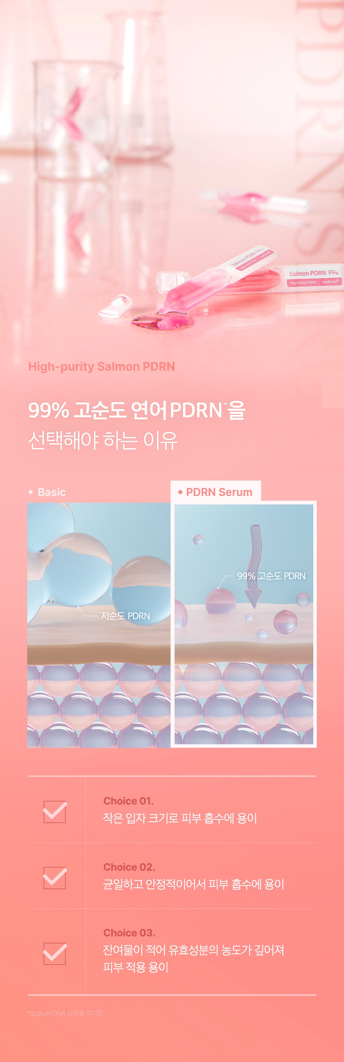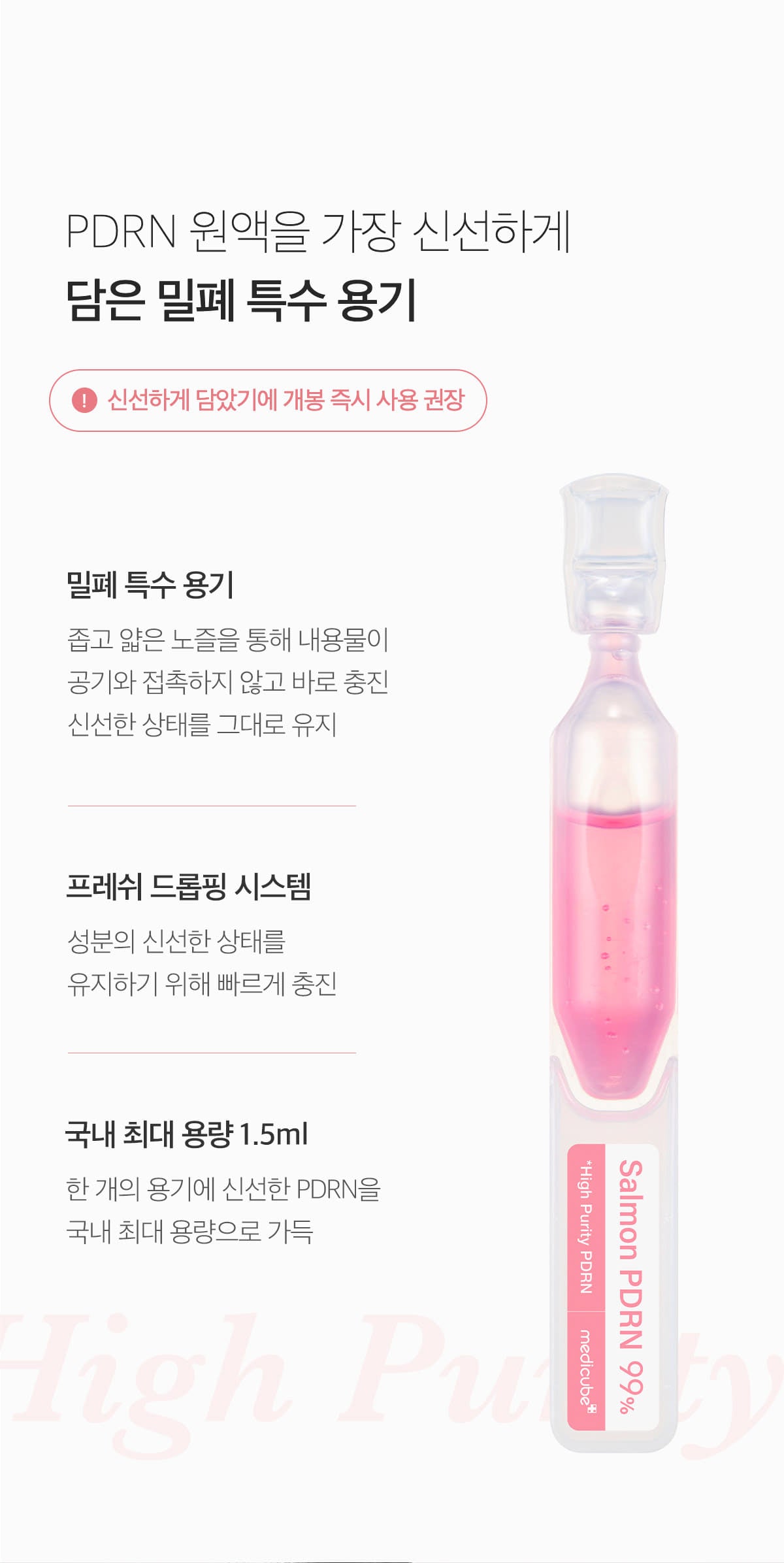 The Medicube PDRN Pink One Day Serum contains 99% high-purity Salmon PDRN (Polydeoxyribonucleotide), which is an advanced skincare ingredient designed to provide effective absorption and address various skin concerns. With its small particle size, the serum penetrates the skin more easily, allowing for better absorption of active ingredients and providing deeper, more concentrated skincare benefits.