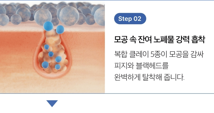 Step 2: Strong absorption of residual impurities from the pores: Five types of complex clays wrap around the pores and help remove sebum and blackheads.