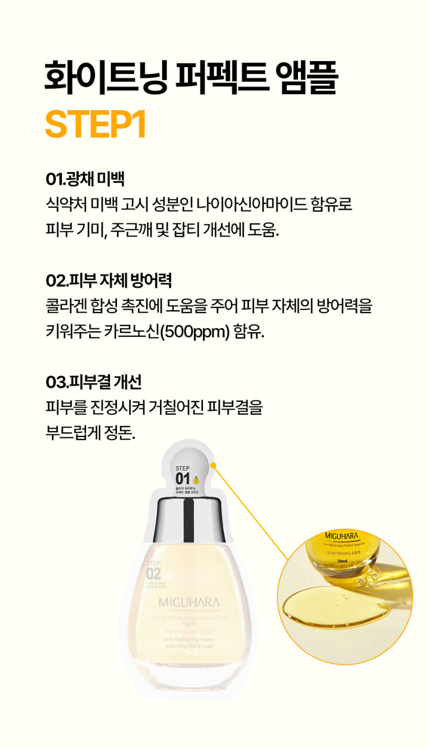 Prepare your skin with a potent ampoule, rich in active ingredients, designed to deeply penetrate and prime the skin for the subsequent steps. This initial boost helps to enhance the mask’s effectiveness and kickstart the brightening process. - Step 2: Whitening Sheet Mask Application