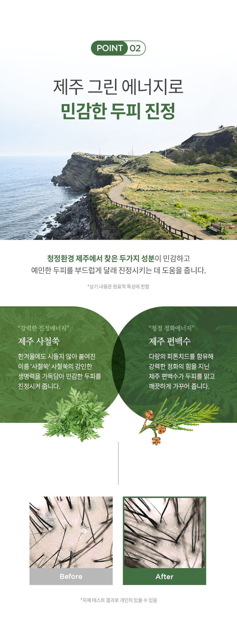 - Jeju Wild Mugwort: With its powerful calming energy and strong vitality, Jeju wild mugwort effectively soothes sensitive scalp irritation.