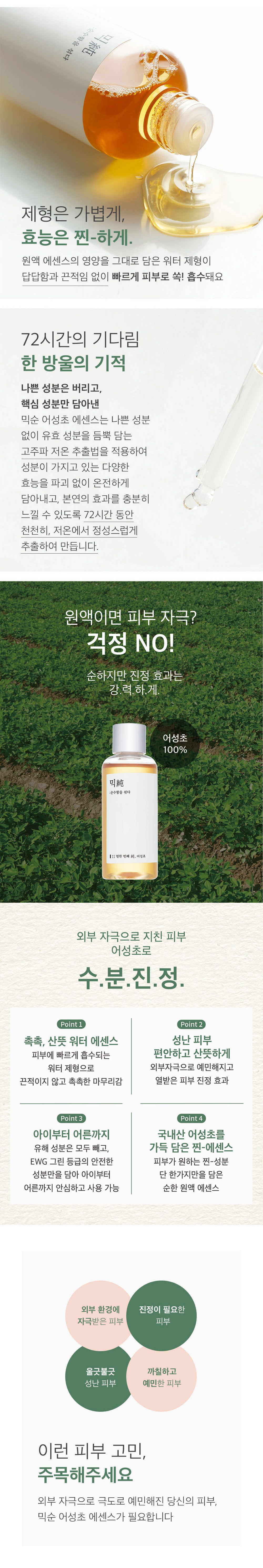 私は最初、Mixsoonのホットウィニア・コルダタエッセンスに半信半疑でした。本当に敏感肌が落ち着く効果があるのでしょうか。しかし、この100mlボトルを使ってみると、その速やかな浸透力には驚きました。ペースト状ではなく軽い水っぽい感じでありながら、すぐにうるおいます。それは皮膚ストレスによる赤みまで和らげてくれたような気がします。地元生産者から得られる純粋な成分ということで安心感も持てますね。この使用経験を通じて、本物の天然スキンケア製品なのだと実感しました。