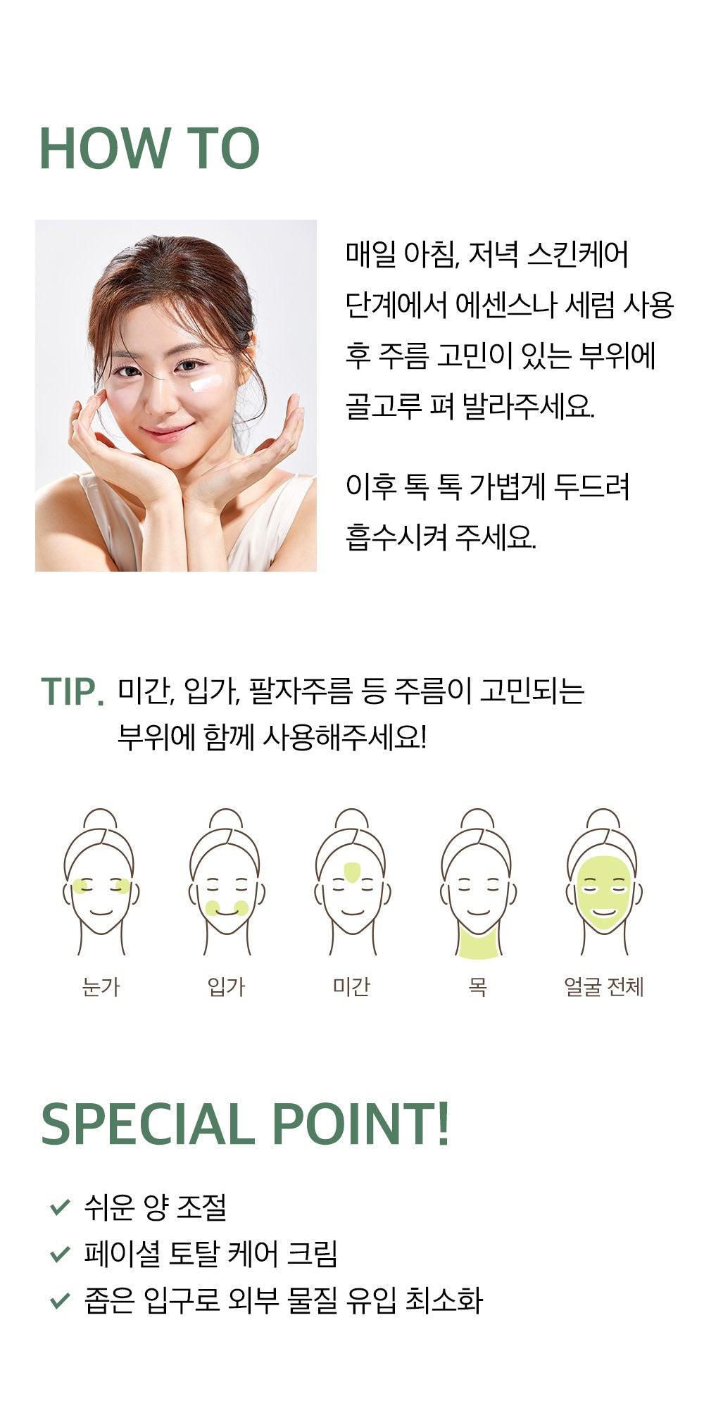 - Morning and Evening Routine: After applying essence or serum, evenly apply the cream to areas prone to wrinkles.