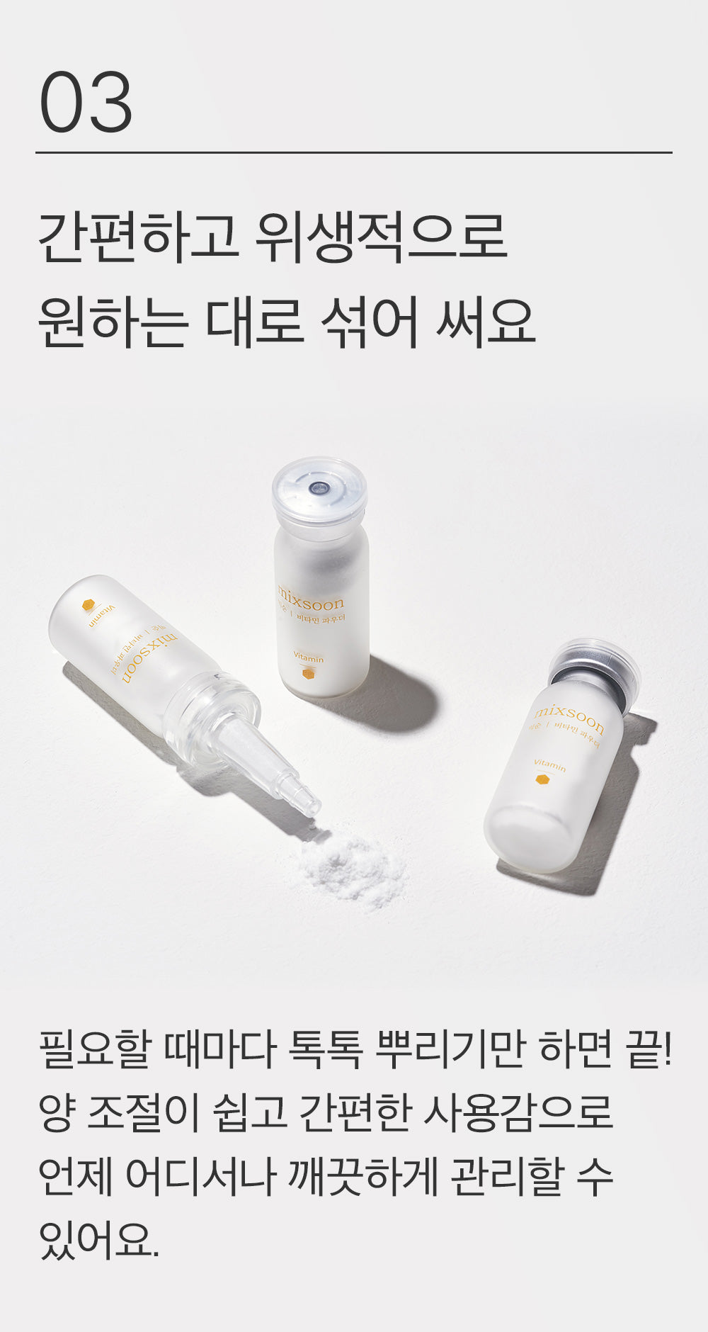 - For an effortless blend, combine the powder with hyaluronic acid serum. If not all the powder dissolves immediately, gently massage the remaining particles onto the skin until fully absorbed.