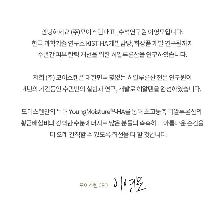 - Ultra-Low Molecular Hyaluronic Acid: Starting from the age of 25, the concentration of hyaluronic acid in our skin begins to decrease, leading to the formation and deepening of wrinkles. The Hyal Plus Pro Ampoule tackles this issue head-on by utilizing Moisten’s cutting-edge technology to dissolve ultra-high concentrations of hyaluronic acid effectively.