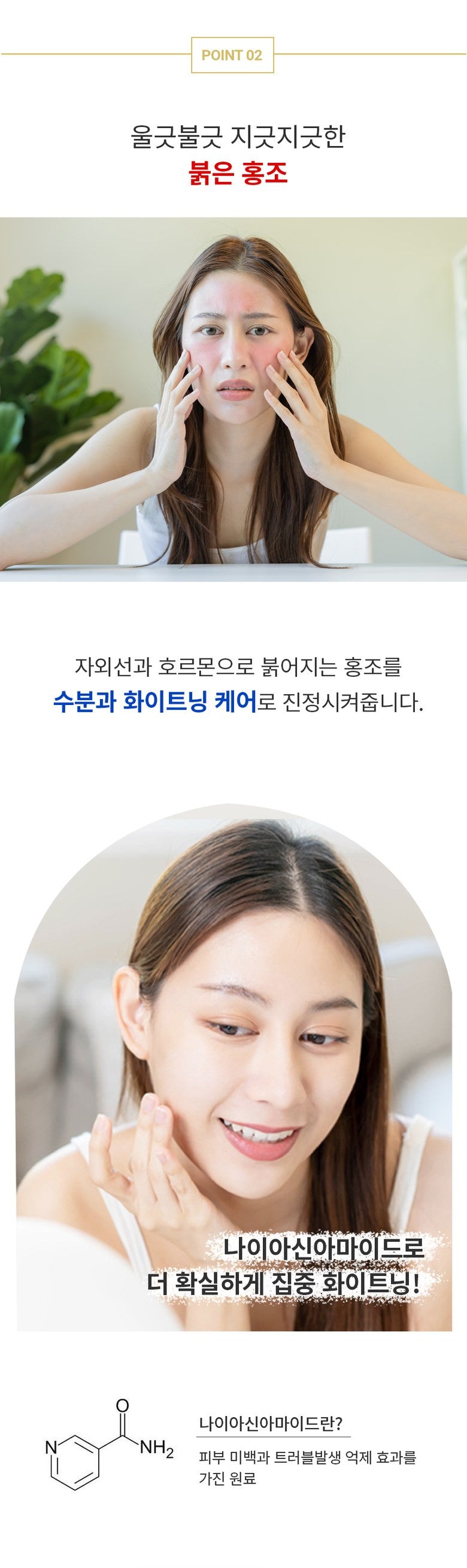 - Skin Soothing and Whitening Care: This serum not only moisturizes but also soothes redness caused by UV rays and hormones. Enhanced with the intensive whitening power of niacinamide, it improves both skin tone and hydration.