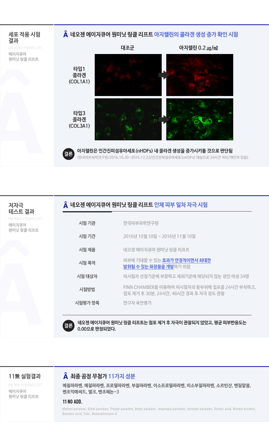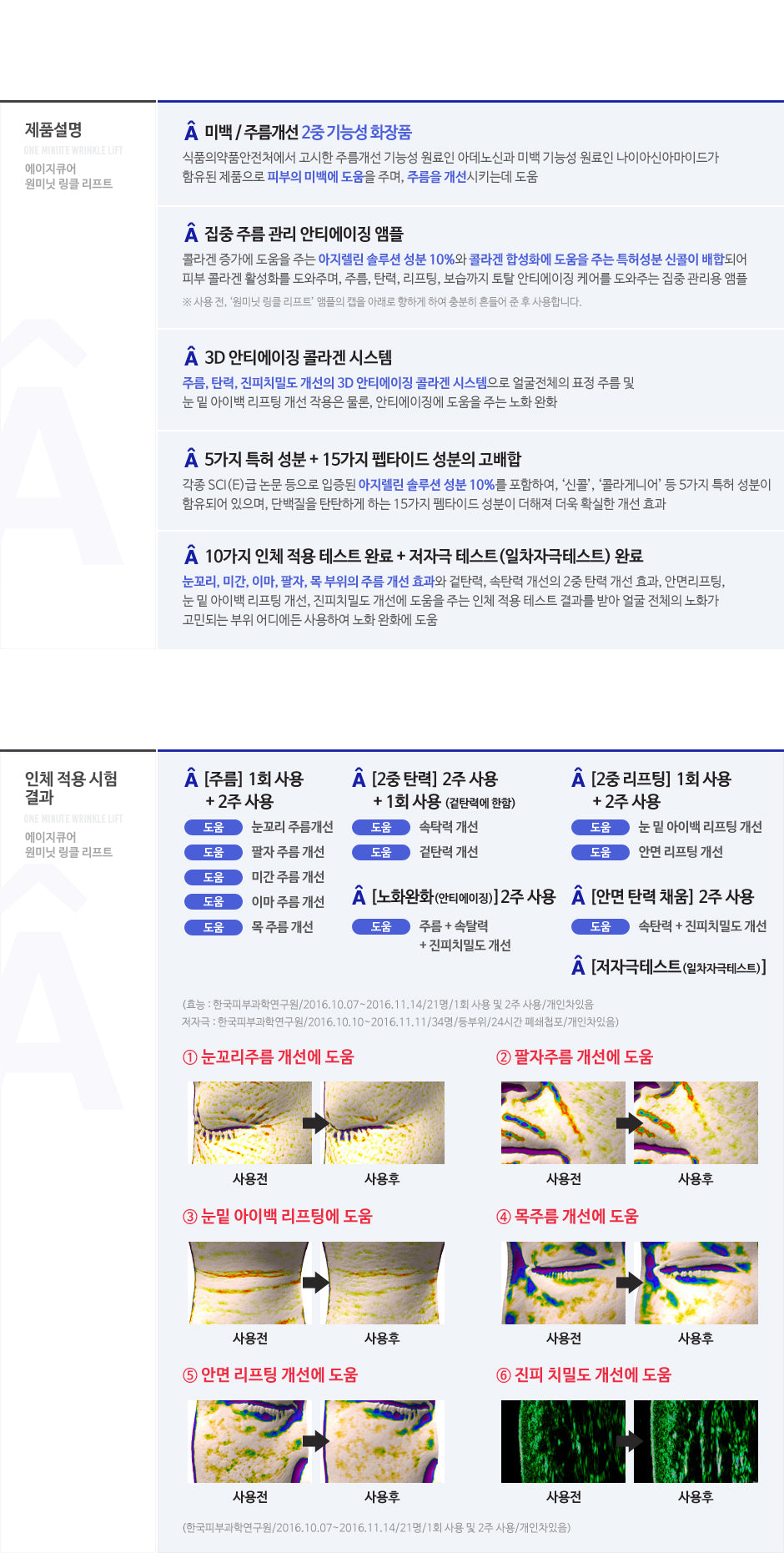 Human application test results showing the effect of improving wrinkles at the corner of the eye, forehead, forehead, sides of the mouth, and neck, as well as the double elasticity effect of improving outer and inner elasticity, facial lifting, improving eye bag lifting under the eyes, and improving dermal density. Use it anywhere on the entire face where aging is a concern to help alleviate aging.
