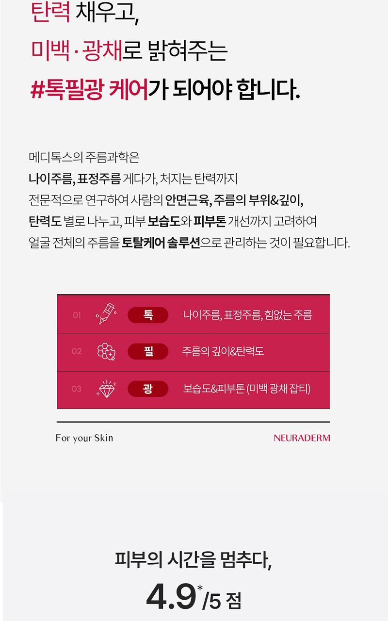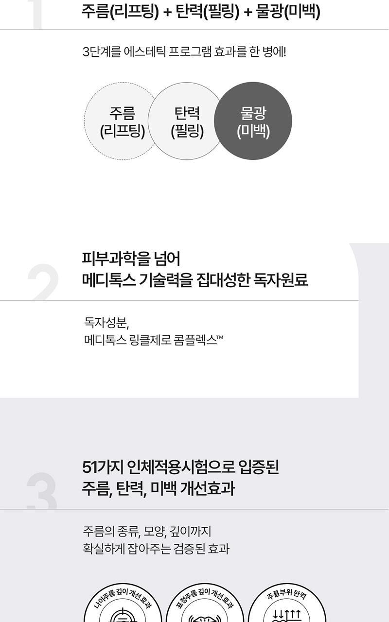 Effective wrinkle care requires a comprehensive approach that targets age wrinkles, expression lines, and emerging fine lines. Medytox’s formula improves wrinkle depth, skin elasticity, hydration, and overall skin tone, ensuring total care and rejuvenation.