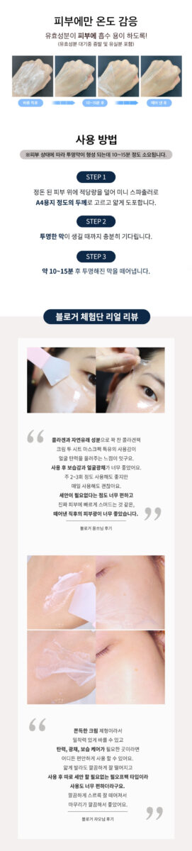 - Adhesion & Absorption: The collagen cream film formulation improves skin adhesion and absorption.