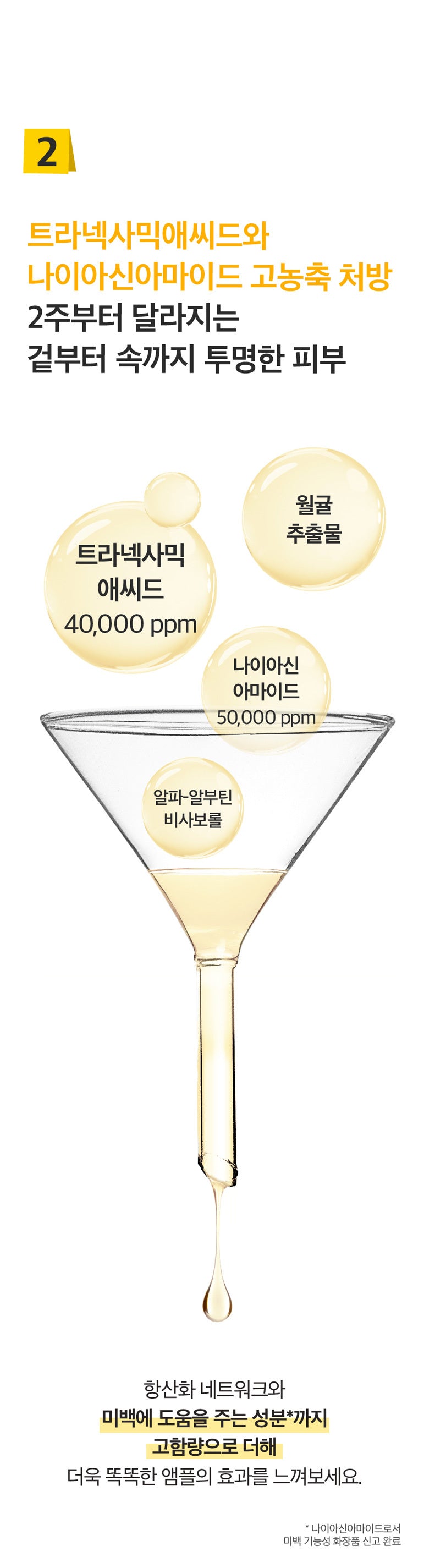 - Niacinamide: 50,000 ppm to inhibit melanin transfer and brighten skin.
