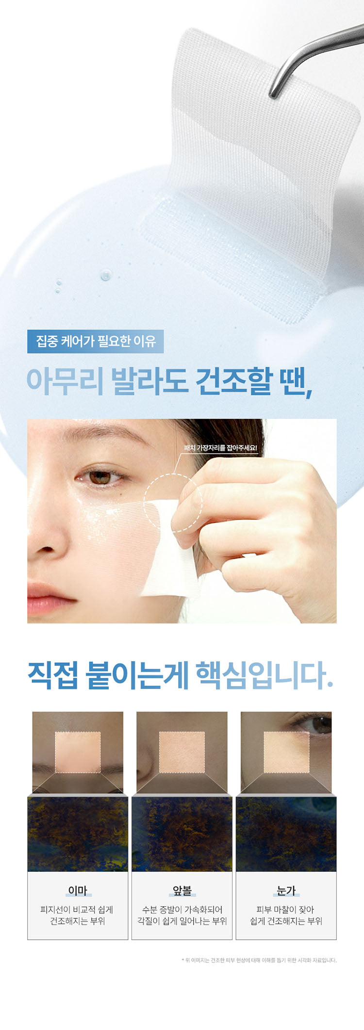 - Apply the Melting Patch: Open the pouch, remove the blue support sheet, and carefully place the patch on the desired dry area of your skin.
