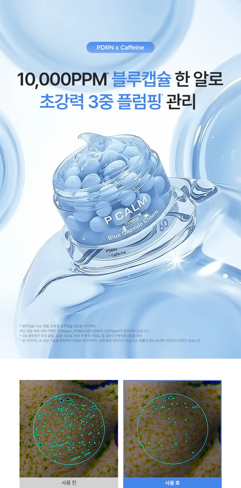 - 10,000PPM Blue Capsules: Each capsule contains Caffeine 7,000ppm + PDRN (Sodium DNA) 3,000ppm for ultra-strong triple plumping