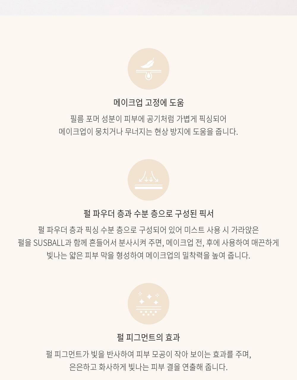 The fixer features a dual-layer composition of pearl powder and moisturizing essence. Shake well before use to mix the settled pearl with the SUSBALL for optimal spray application. This creates a thin, radiant layer on your skin, enhancing makeup adherence and longevity.