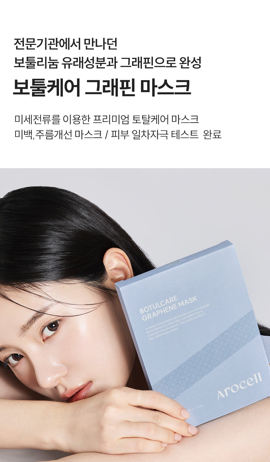The Arocell Botulcare Graphene Mask is a revolutionary total-care mask infused with botulinum-derived peptides and graphene technology. Designed for whitening and wrinkle improvement, this mask enhances skincare effectiveness using microcurrent conductivity.