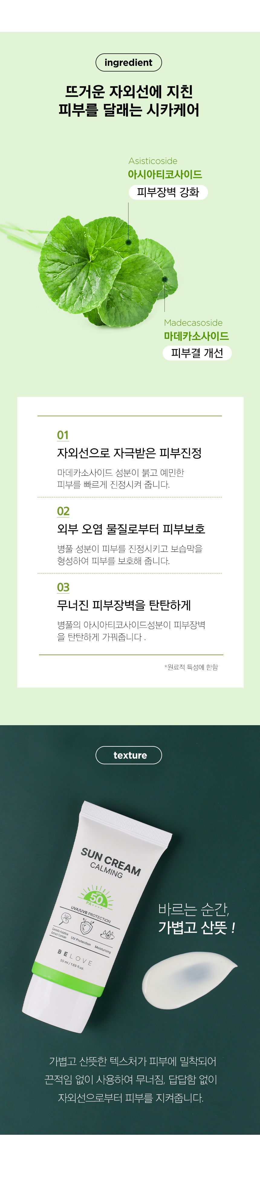 The centella asiatica component soothes the skin and forms a moisturizing film to protect the skin.