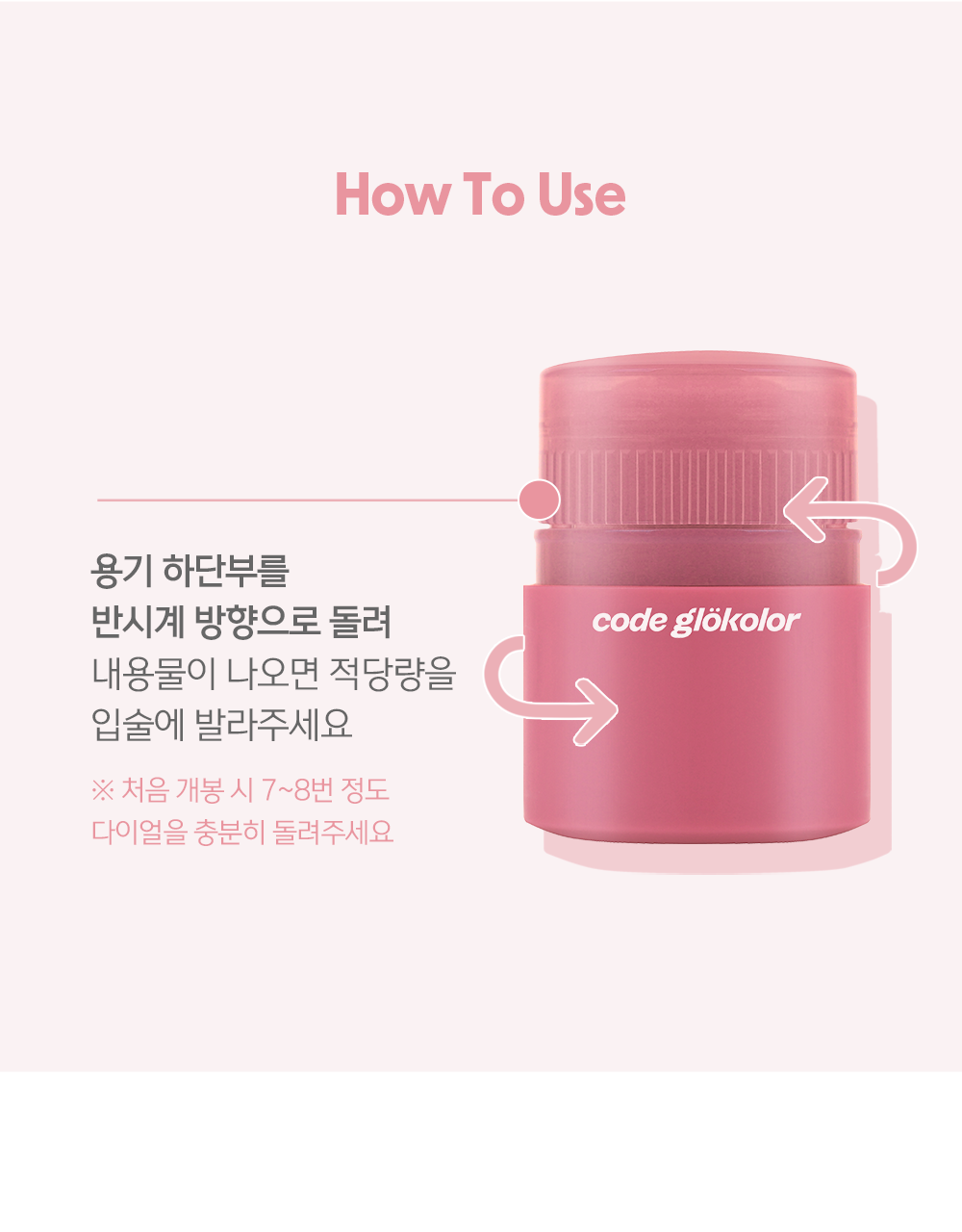 Simply twist the bottom of the container counter-clockwise. Upon the emergence of the product, glide an appropriate amount over your lips. For initial use, activate the mechanism by turning the dial 7 to 8 times.
