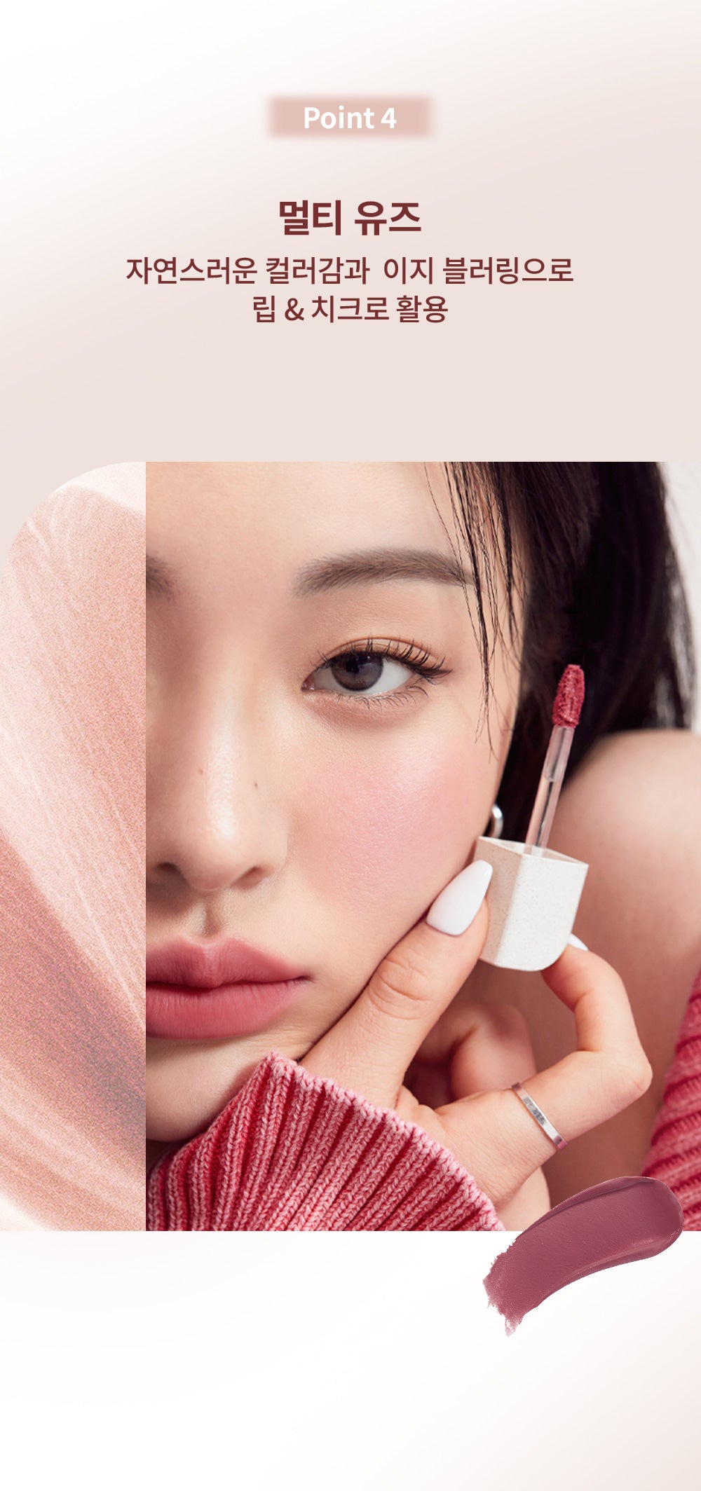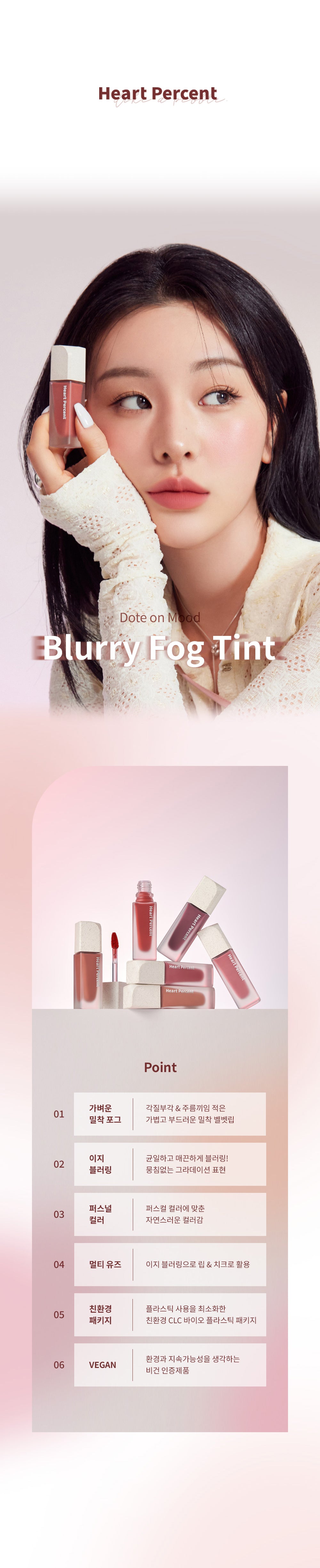 The Heart Percent Dot On Mood Blury Fog Tint is an incredible multi-use product! Its unique light, velvety texture adheres smoothly to my skin, giving me a beautifully gradient lip look without the clumping that I often encounter with matte lipsticks. I’ve used it on both my lips and cheeks, and the versatility of its natural colors allows for easy mixing and matching. Plus, it minimizes the appearance of fine lines beautifully—my lips feel soft yet defined all day long.