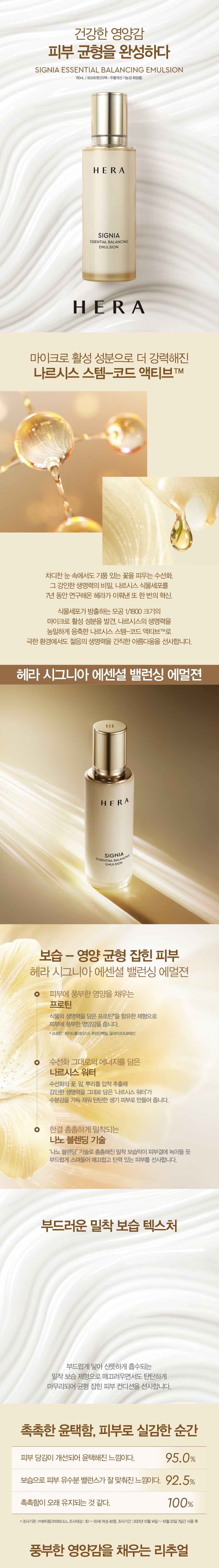新しい製品、HERA SIGNIA ESSENTIAL BALANCING EMULSIONはまさに感動的でした。ダルの見えた肌を生き返らせるような仕上がりです。その使い心地も驚くほど軽やかで、それでいてしっかりと保湿されています。他の商品とも比較しましたが、このエマルジョンには他にはないユニークな香りがあります。このナーフィスの成分のお陰で自然由来とは思えない程リフレッシュされた気持ちになりますよ。そして、お花から抽出した水分が特別なお手入れになるので、一日中光輝けそうです。また絶対買います!
