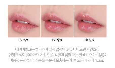 The color of baby pink is not very deep, but after 3-5 applications, it naturally turns into a light pink color. Occasionally, when the chapped lips are severe, it helps a lot to replenish moisture by applying a light lip balm to your heart’s content.
