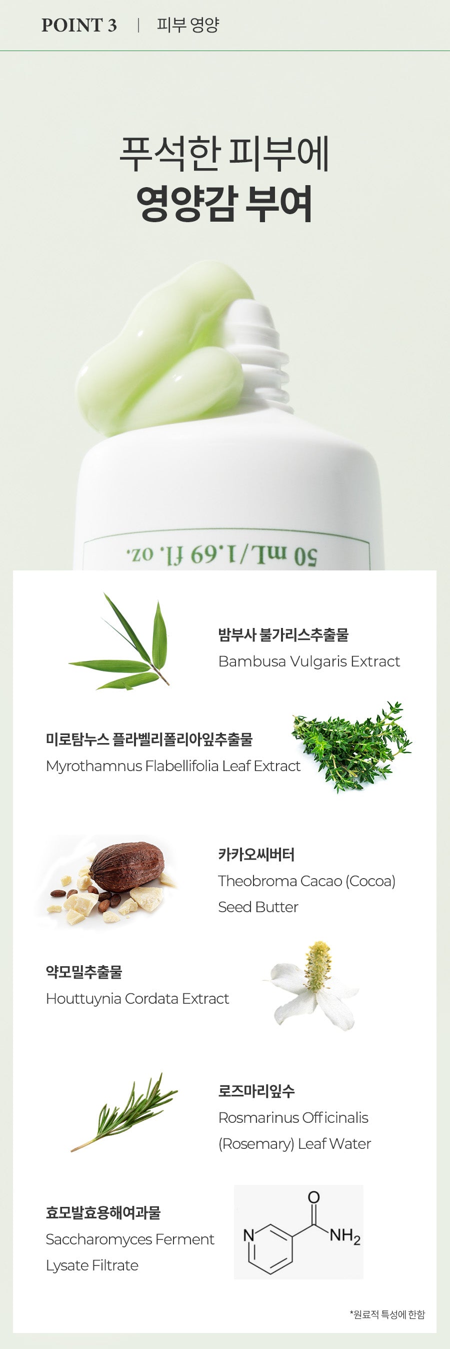 - Infused with Bamboo Bulgaris Extract, Myrothamnus Flavellifolia Leaf Extract, Cacao Seed Butter, and Rosemary Leaf Water to boost skin vitality and radiance.