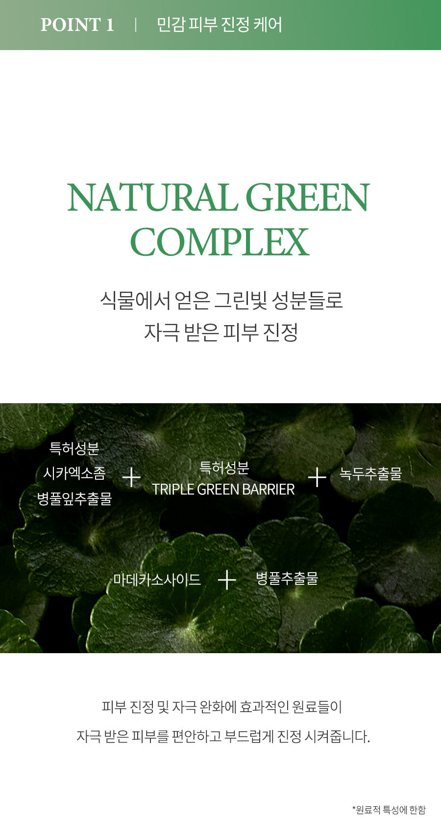 - Natural Green Complex: Combines Centella Asiatica leaf extract, Green bean extract, and Madecassoside for gentle relief from irritation.